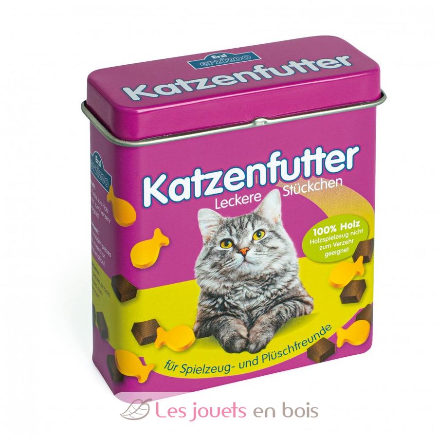 Comida para gatos en madera, una imitación de juego fabricada en Alemania por la marca Erzi.