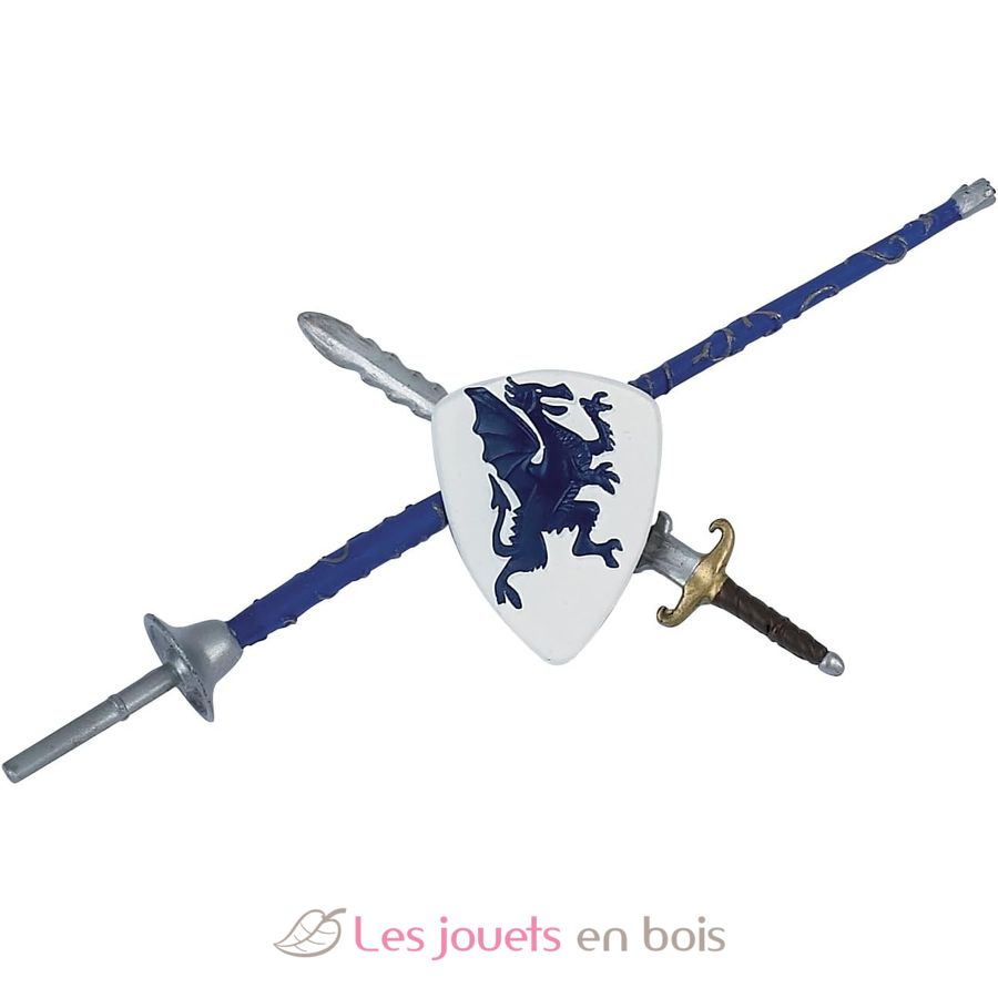 El contenido suele incluir: un escudo azul, una lanza de justas azul, una lanza de justas roja, una maza y cinco espadas. El contenido puede variar.