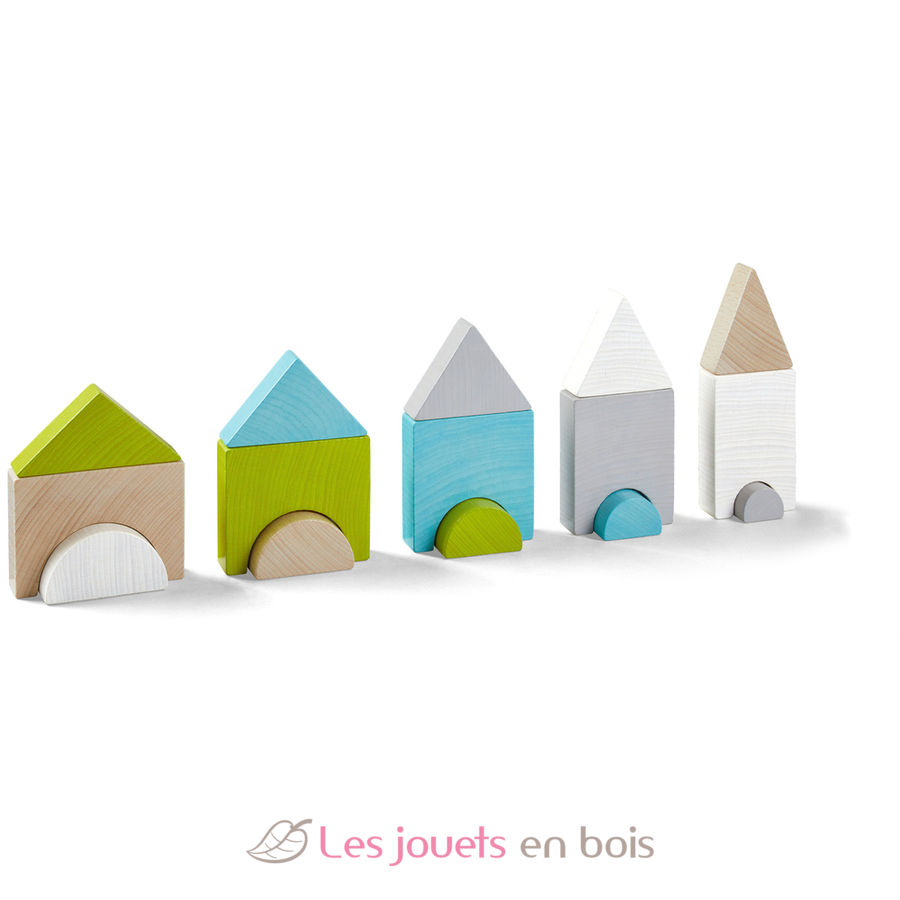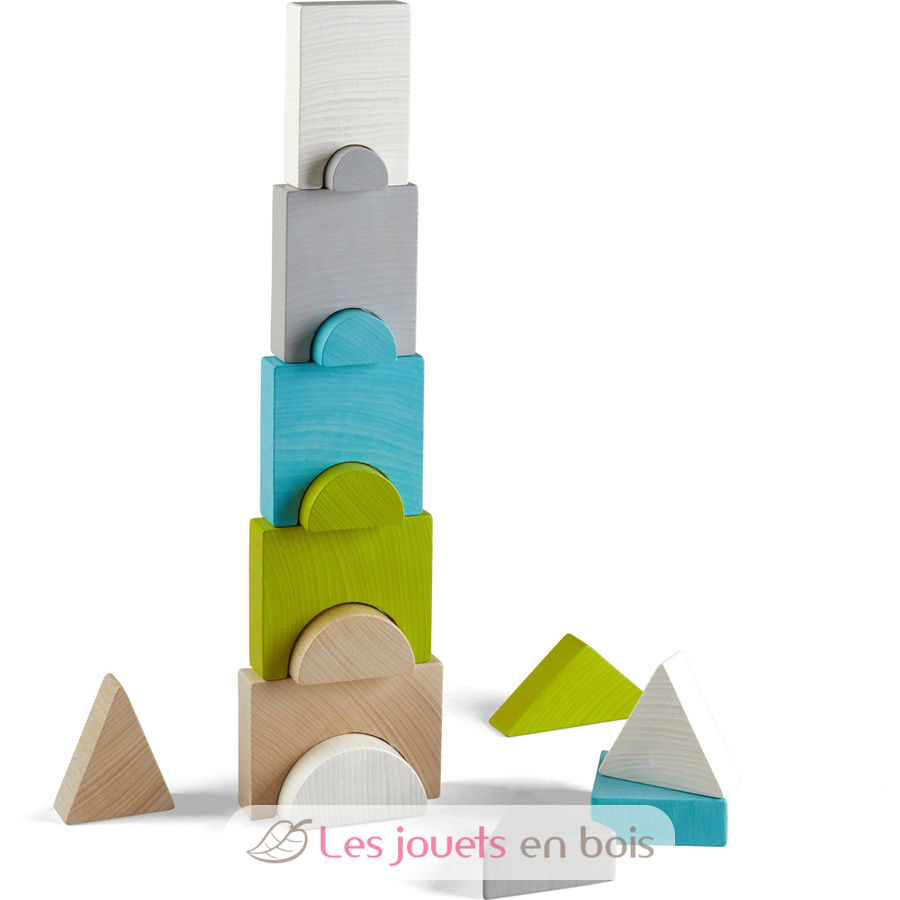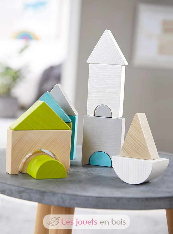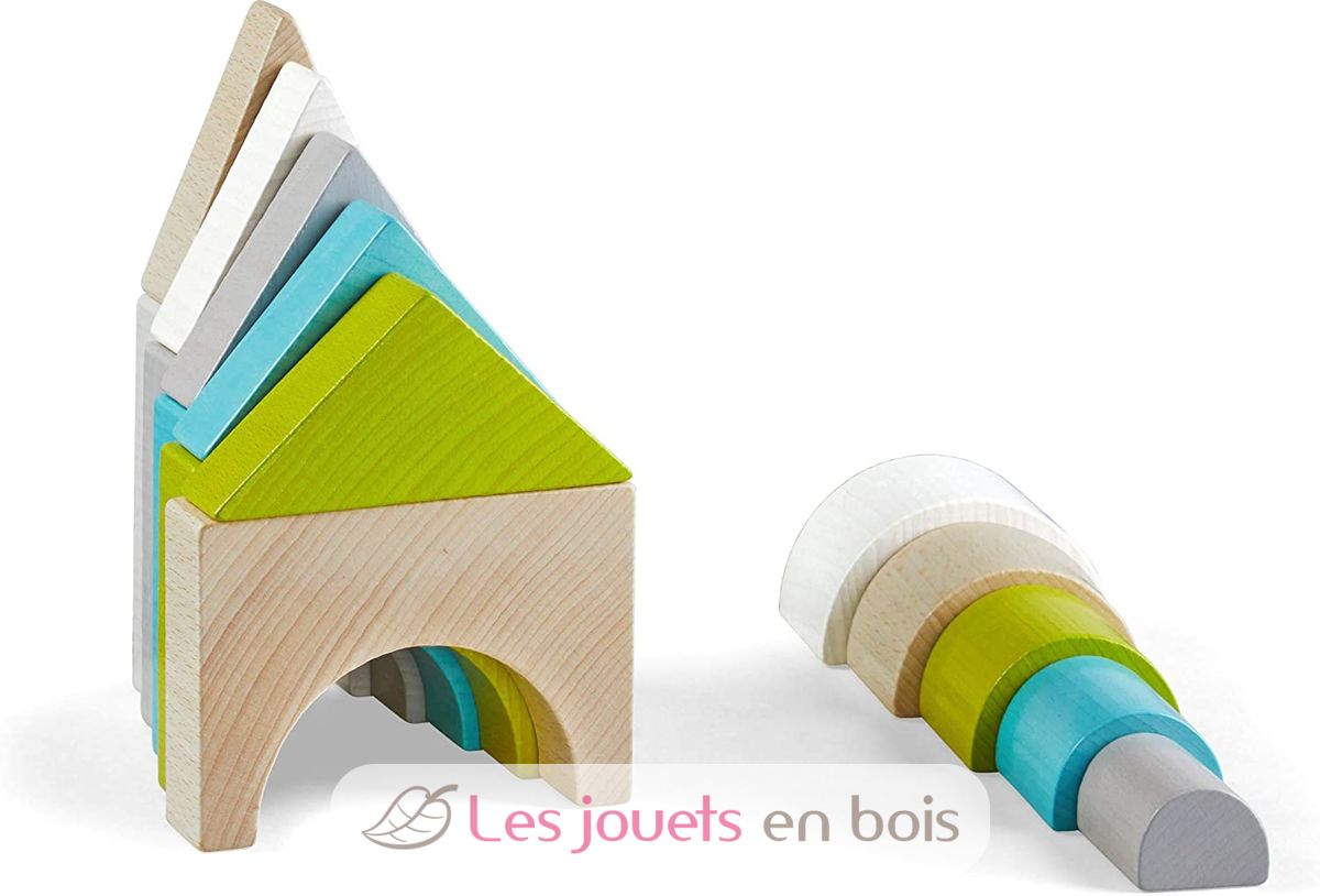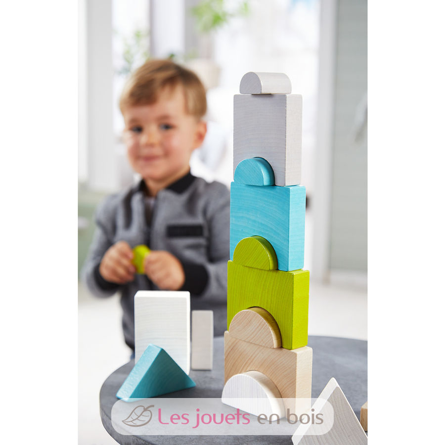 Este juego de construcción de 15 bloques de madera estimula la motricidad fina y la coordinación mano-ojo, así como la representación tridimensional.