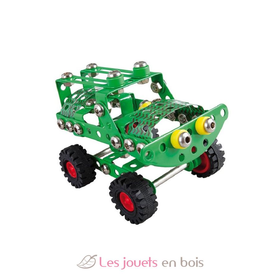 Un juego de construcción atemporal de metal cromado, con piezas de plástico de colores, que se ensamblan con tornillos y tuercas. 100% fabricado en Europa.