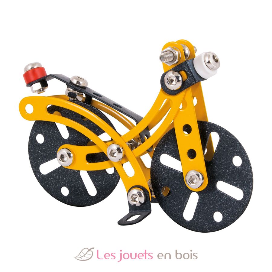 Un juego de construcción atemporal de metal cromado, con piezas de plástico de colores, que se ensamblan con tornillos y tuercas. 100% fabricado en Europa.