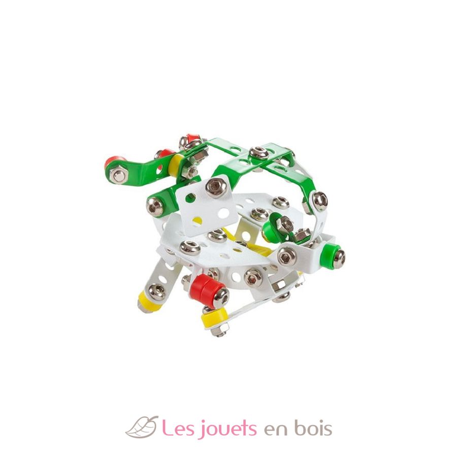 Un juego de construcción atemporal de metal cromado, con piezas de plástico de colores, que se ensamblan con tornillos y tuercas. 100% fabricado en Europa.
