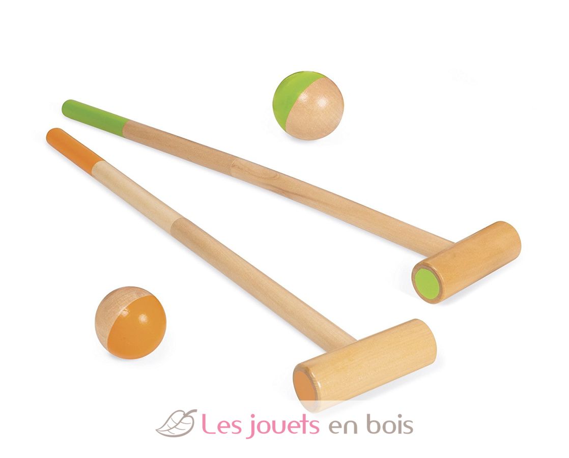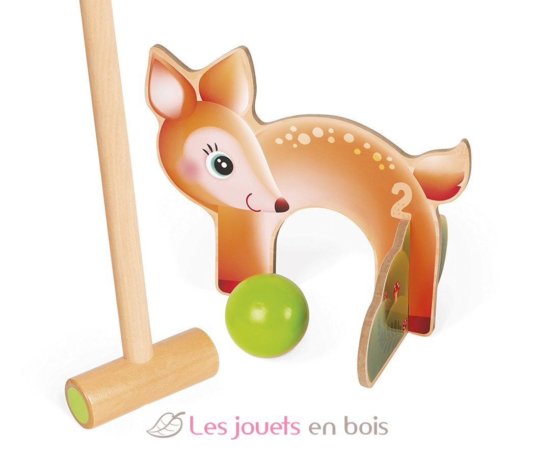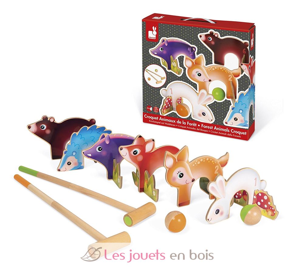 Croquet de madera Animales del Bosque de la marca Janod! ¡Gustará a grandes y pequeños! Un jabalí, un oso, una cierva, un conejo... ¡Los arcos tienen forma de animales para hacerlo aún más divertido! ¿Quién será el primero en pasar por todos los aros que conducen a la victoria? Este juego de Croquet Animales del Bosque contiene 2 mazos (9 x 3,2 x 52 cm), 2 bolas (5 cm de diámetro) y 6 aros. Croquet Animales del Bosque, un juego de croquet para niños de la marca Janod. Referencia 03207.