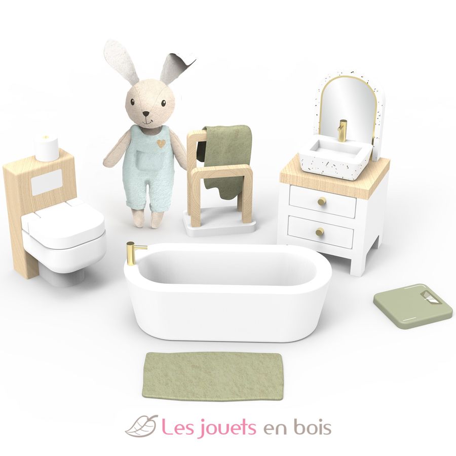Adéntrate en un mundo de imaginación con este conjunto de accesorios de madera para el cuarto de baño de la casa de muñecas, que incluye un pequeño conejo de tela (9cm).