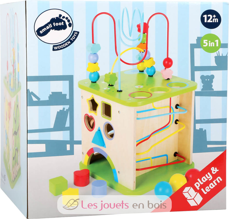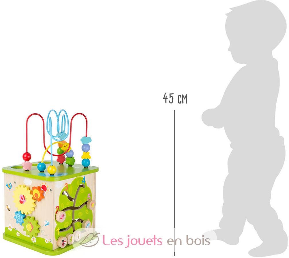 ¡El mundo mágico de juegos de los niños es infinito! Aquí están reunidas cuatro fantásticas ideas de juegos en un robusto cubo de madera, además de formas para encajar y de un circuito de alambre sobrepuesto, están integrados una pista de canicas, un juego de coordinación para aprender a contar y una pared de engranajes.