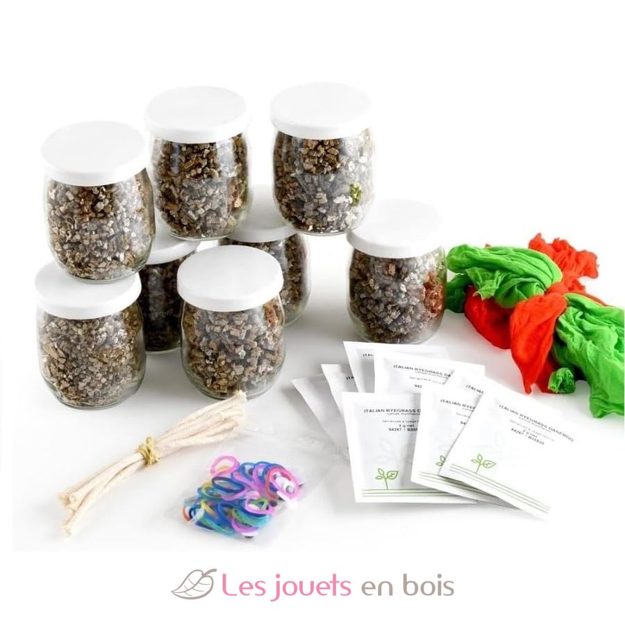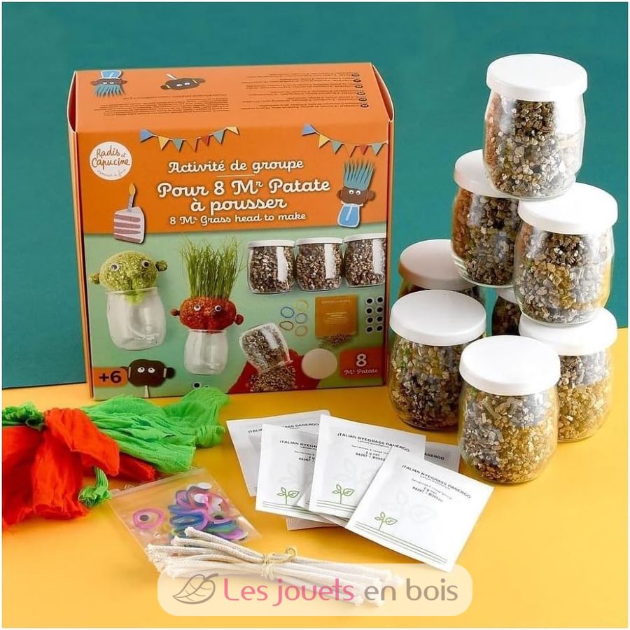 Este kit de manualidades es ideal para un taller divertido y creativo, en el aula o en una fiesta de cumpleaños con amigos (para 8 niños). Cada niño podrá crear su propio Sr. Césped y llevárselo a casa para ver cómo crece su pelo día a día.