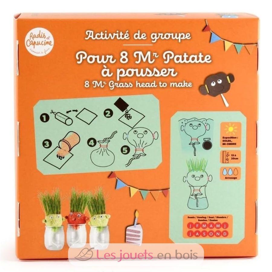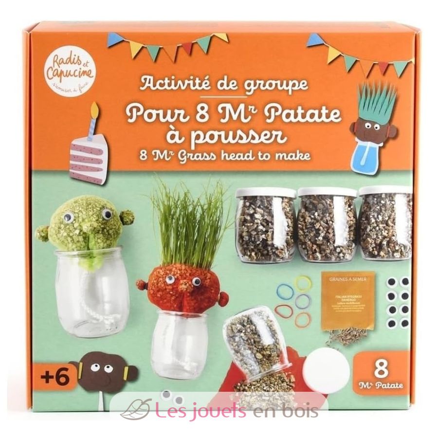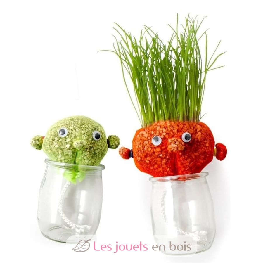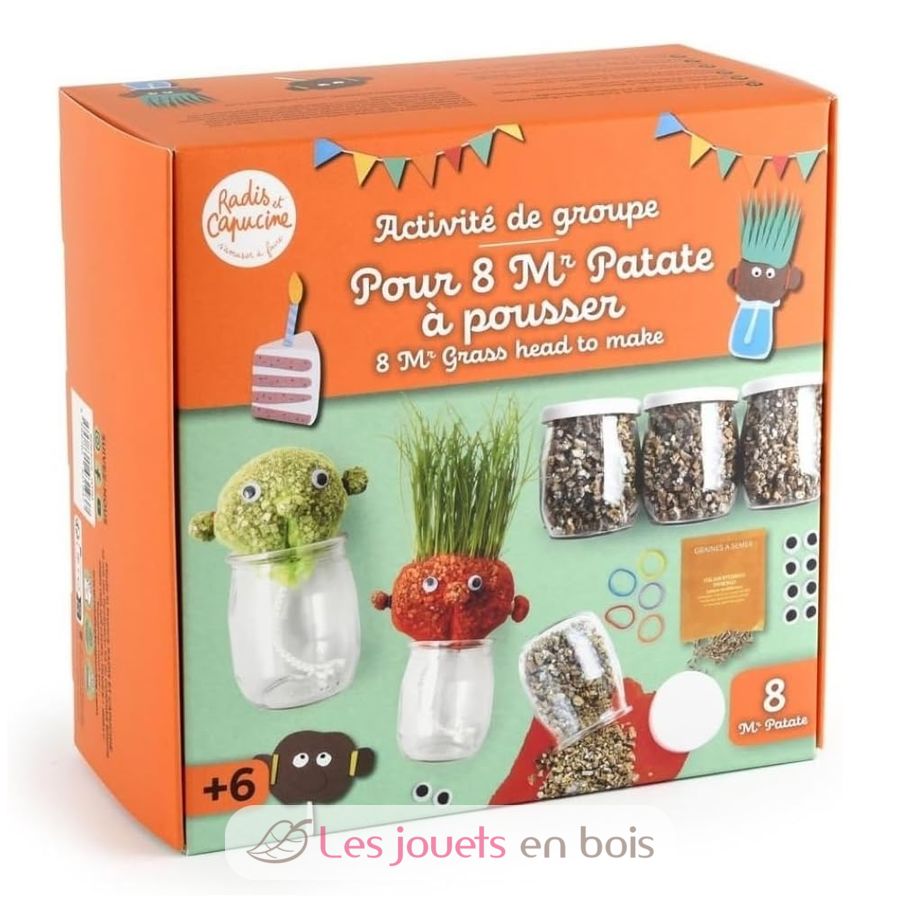 ¡Aquí tienes un kit divertido y creativo para cultivar... un corte de pelo para el Sr. Césped! Simplemente siembra las semillas en su cabeza, riégalas un poco cada día y, en unos días, los niños verán aparecer una divertida mata de pelo verde.