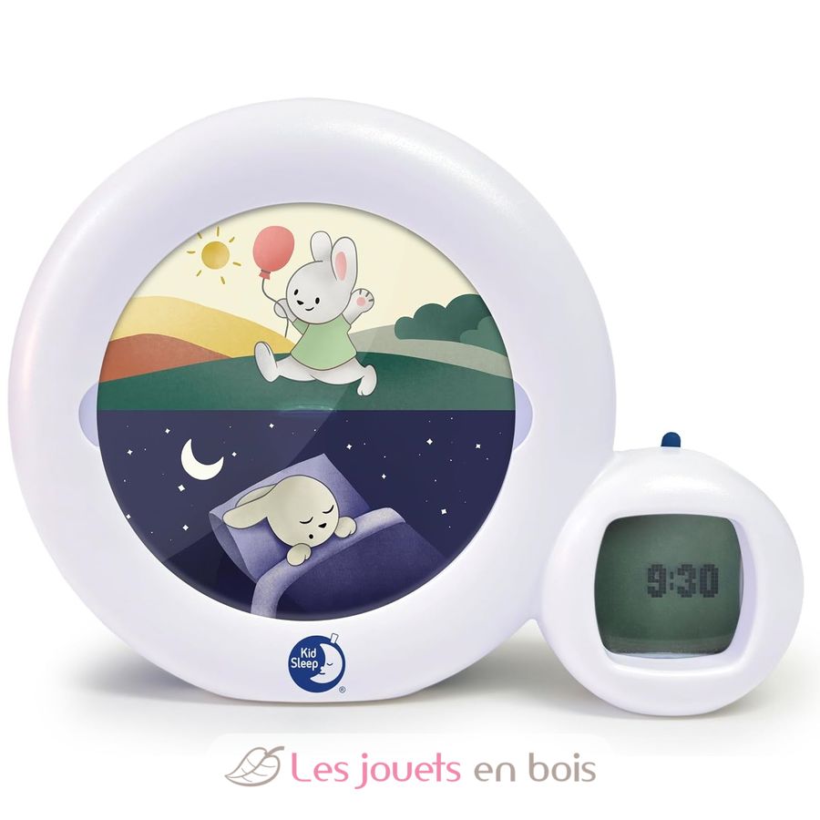 A partir de los 2 años y medio, la Luna del Niño se convierte en un indicador del despertar. ¡Por la mañana, cuando la luna empieza a ponerse (duración ajustable), el niño sabe que pronto es hora de levantarse! Por la noche, cuando el sol se pone (duración regulable), el niño sabe que es casi la hora de irse a la cama. La figura se ilumina en la posición de dormir con la luna, todavía es hora de dormir. A la hora fijada por los padres, sale el sol y la figurita pasa a la posición de despierto, ¡el niño sabe que puede levantarse! 3 ajustes posibles: noche, siesta y fin de semana.