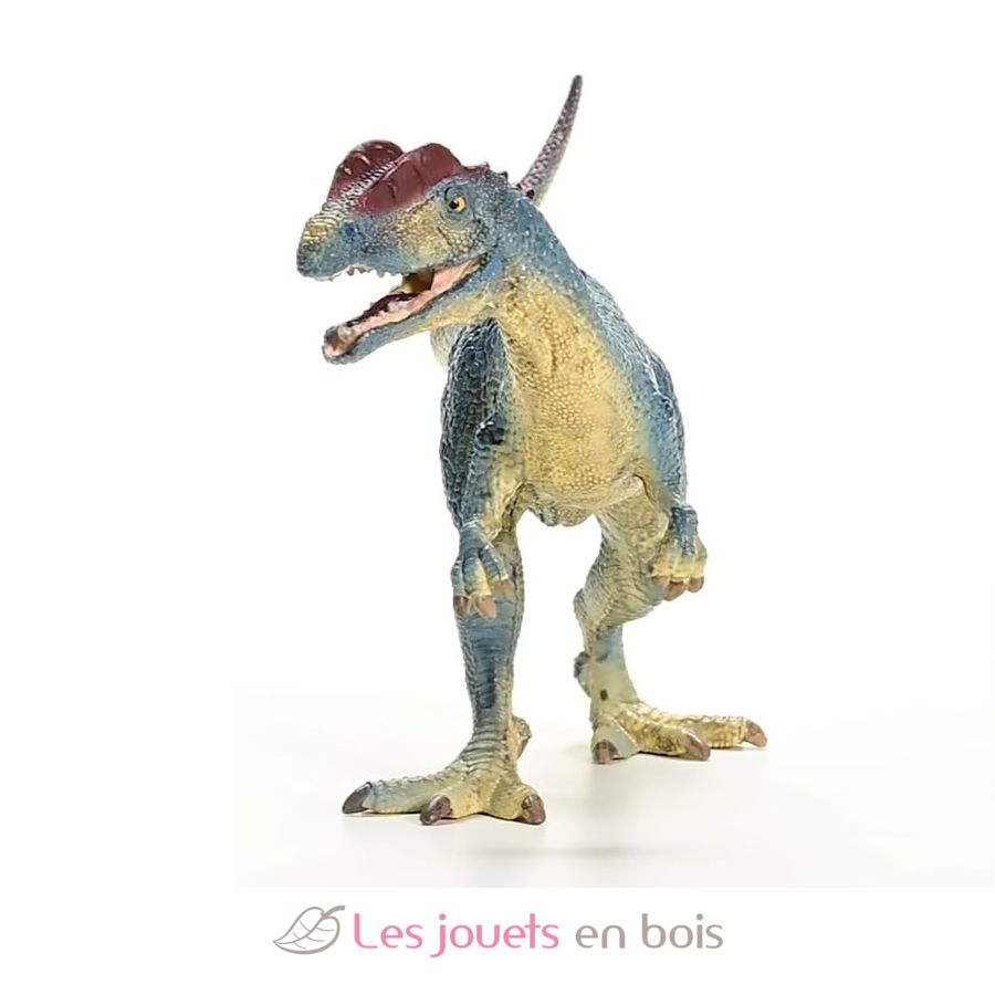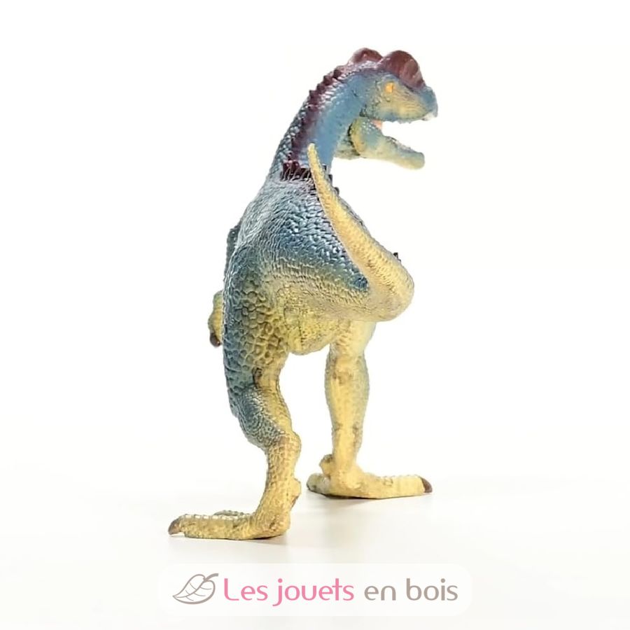 El dilophosaurus es fácilmente reconocible por sus dos crestas óseas que sobresalen en su cabeza. De color rojo brillante, se pueden ver desde lejos. También tiene una cresta dentada de color rojo intenso a lo largo de su espalda hasta la punta de su cola. Su hermosa piel de lagarto es de color azulado en su espalda y patas. Espléndido !