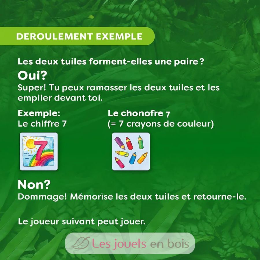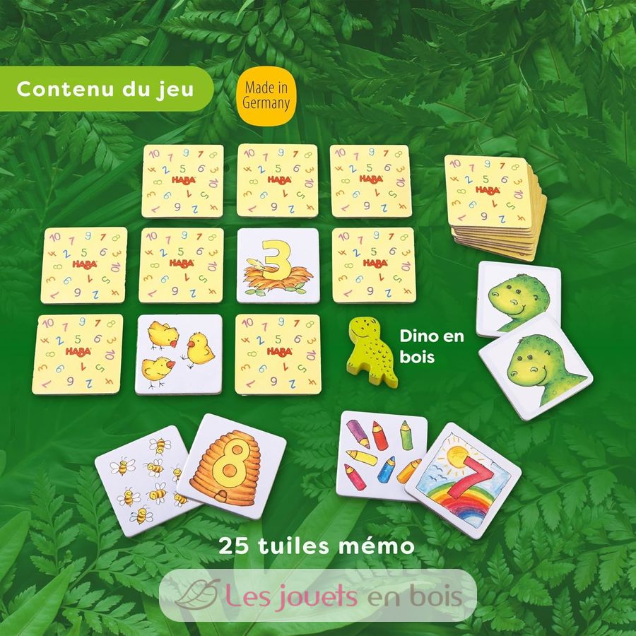 1 dinosaurio de madera, 25 fichas de memoria, 1 instrucciones del juego.