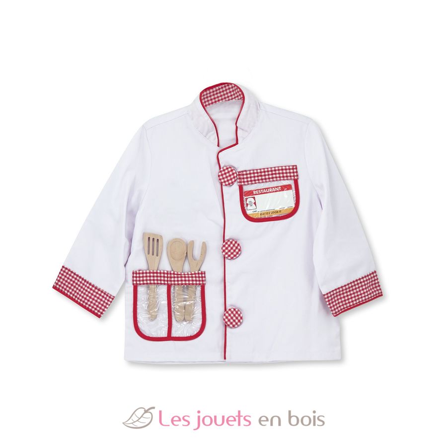 Disfraz de cocinero para niños de 3 a 6 años: una chaqueta, un gorro de cocinero, un juego de cucharas medidoras, dos utensilios de madera, una agarradera y una etiqueta para personalizar el disfraz con el nombre del niño. Traje lavable a máquina.