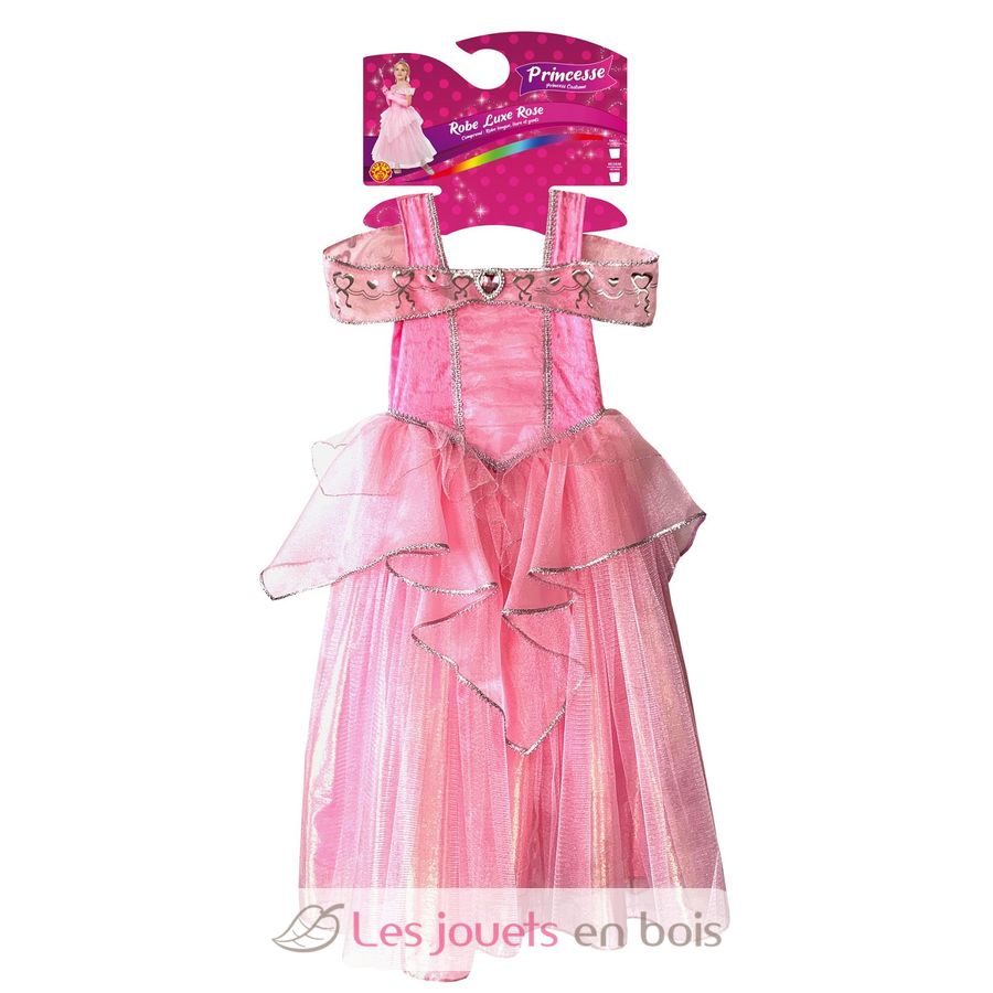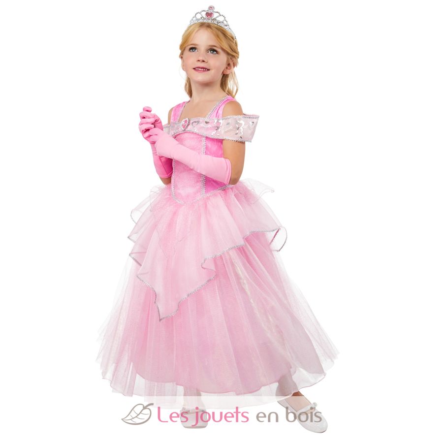 Este disfraz infantil incluye un vestido rosa brillante de princesa, una tiara y guantes.