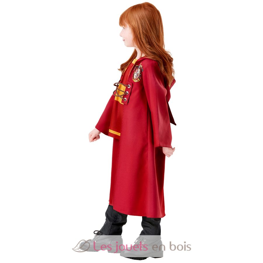Este disfraz infantil incluye una capa de quidditch de tela roja y amarilla con capucha integrada, el escudo de Gryffindor impreso en el pecho, cierres con cordones en la parte delantera y una parte superior de jersey estampada integrada en la capa.