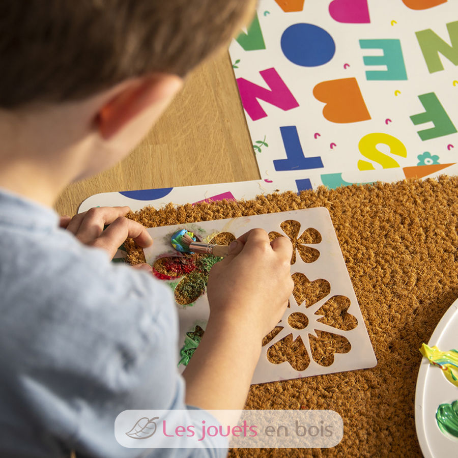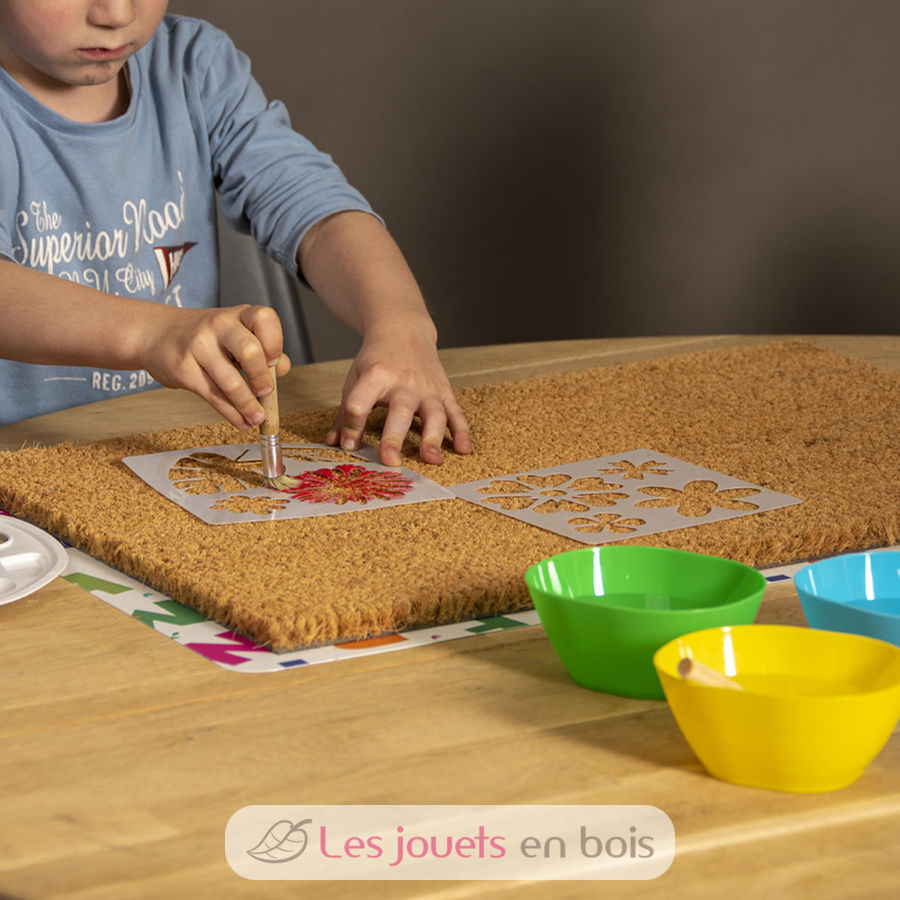 Este set se compone de un felpudo de fibra de coco (60 x 40 cm), varias hojas de plantillas, un pincel y pintura para felpudos. ¡Con un poco de imaginación y estos materiales se pueden crear los felpudos personalizados más bonitos!