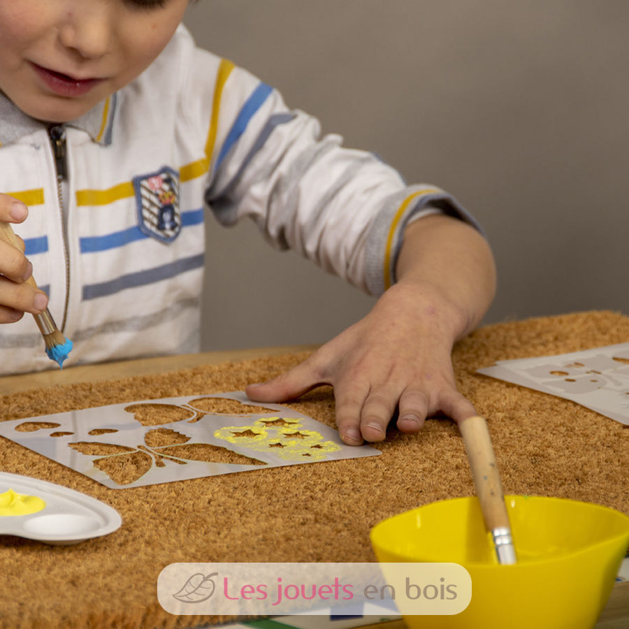 Este set se compone de un felpudo de fibra de coco (60 x 40 cm), varias hojas de plantillas, un pincel y pintura para felpudos. ¡Con un poco de imaginación y estos materiales se pueden crear los felpudos personalizados más bonitos!