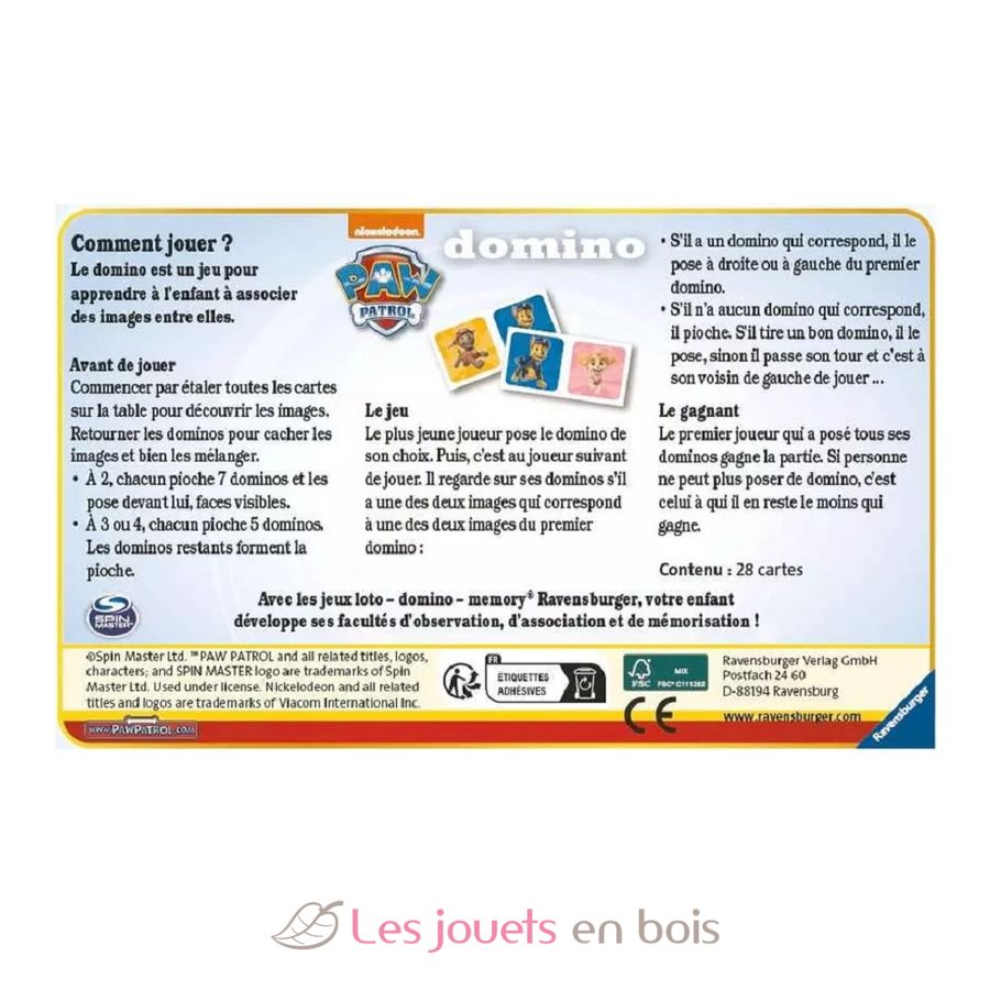 Este juego consta de 28 fichas de dominó de madera con certificación FSC que representan a tus héroes de Paw Patrol.