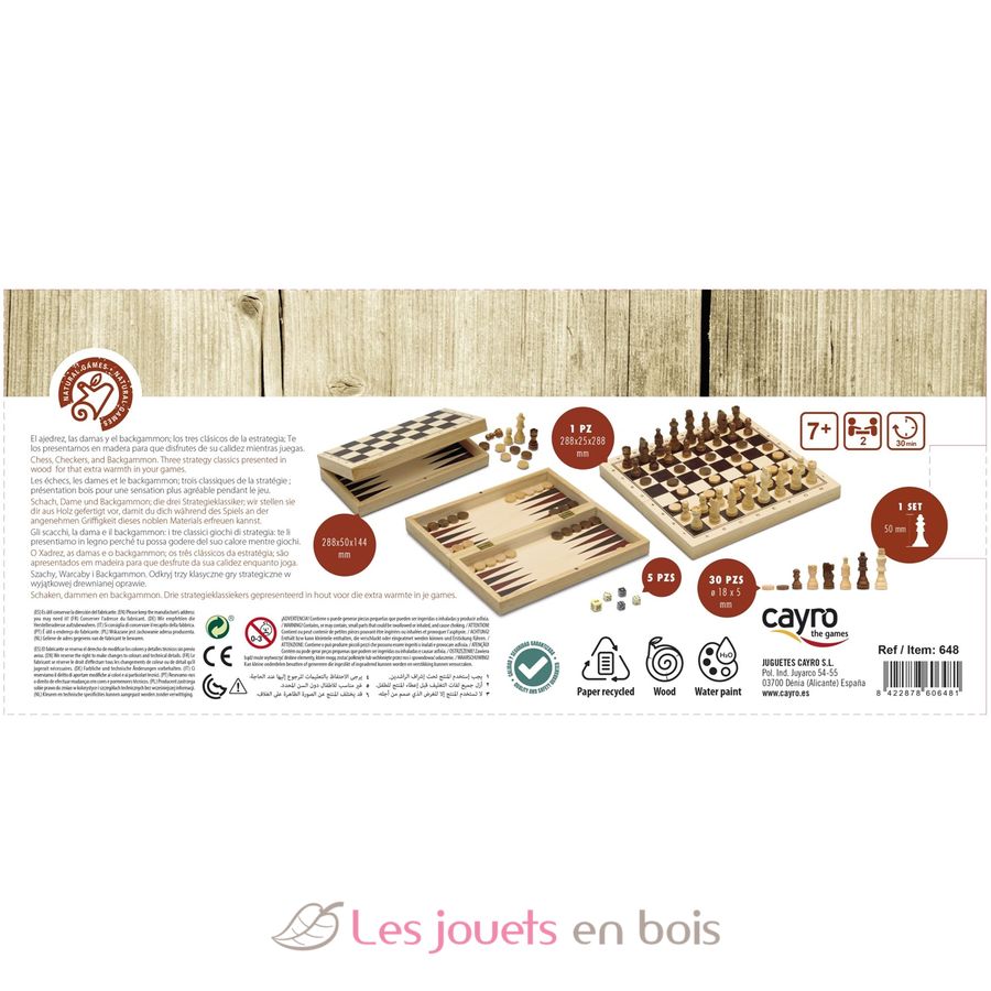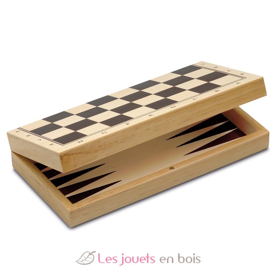Tres juegos de estrategia en una caja de juegos 3 en 1: ajedrez, damas y backgammon.