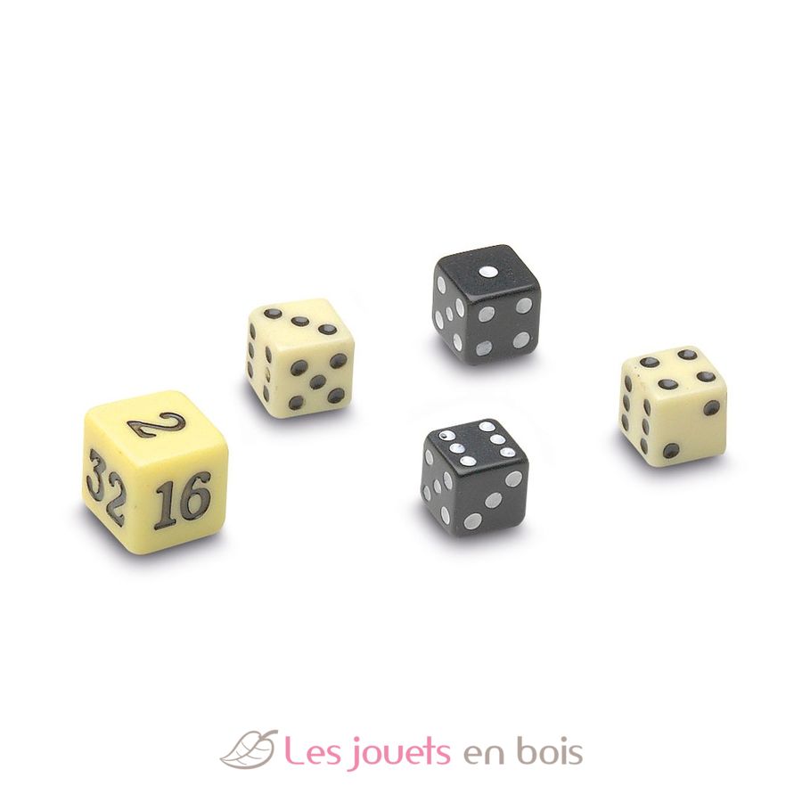 Tamaño del tablero de juego: 29 x 29 cm. Las piezas son de madera y los dados son de resina.
