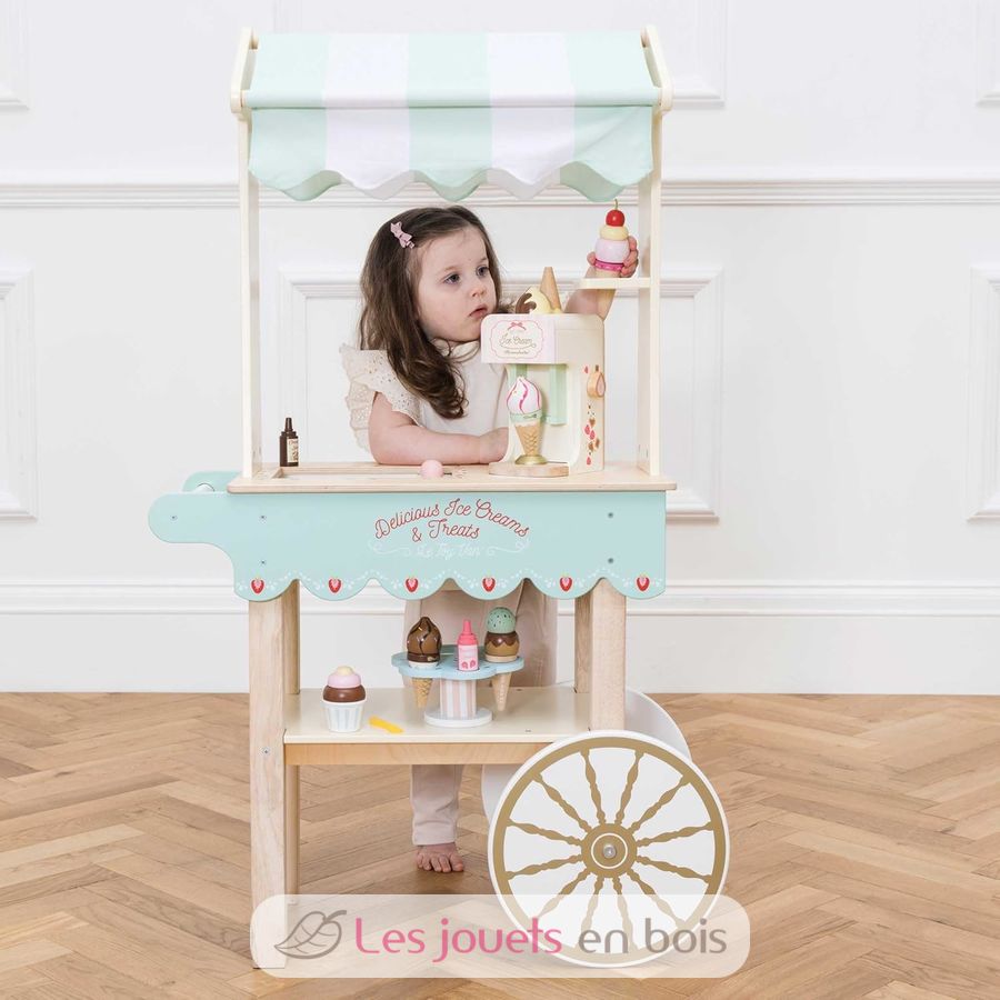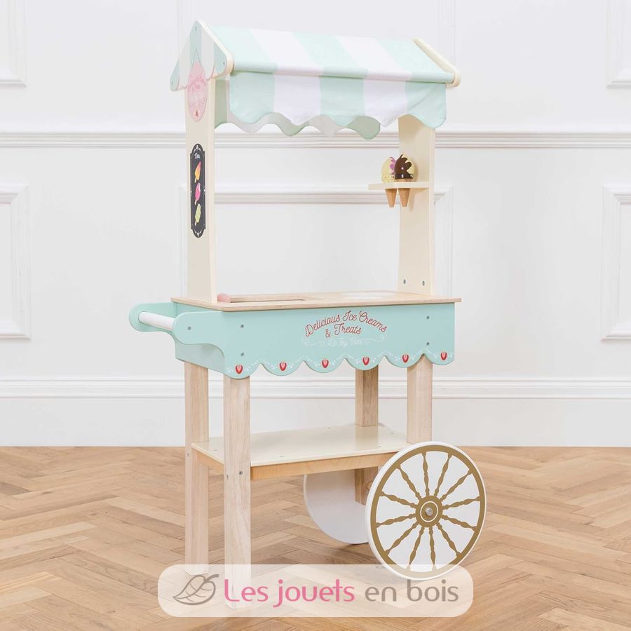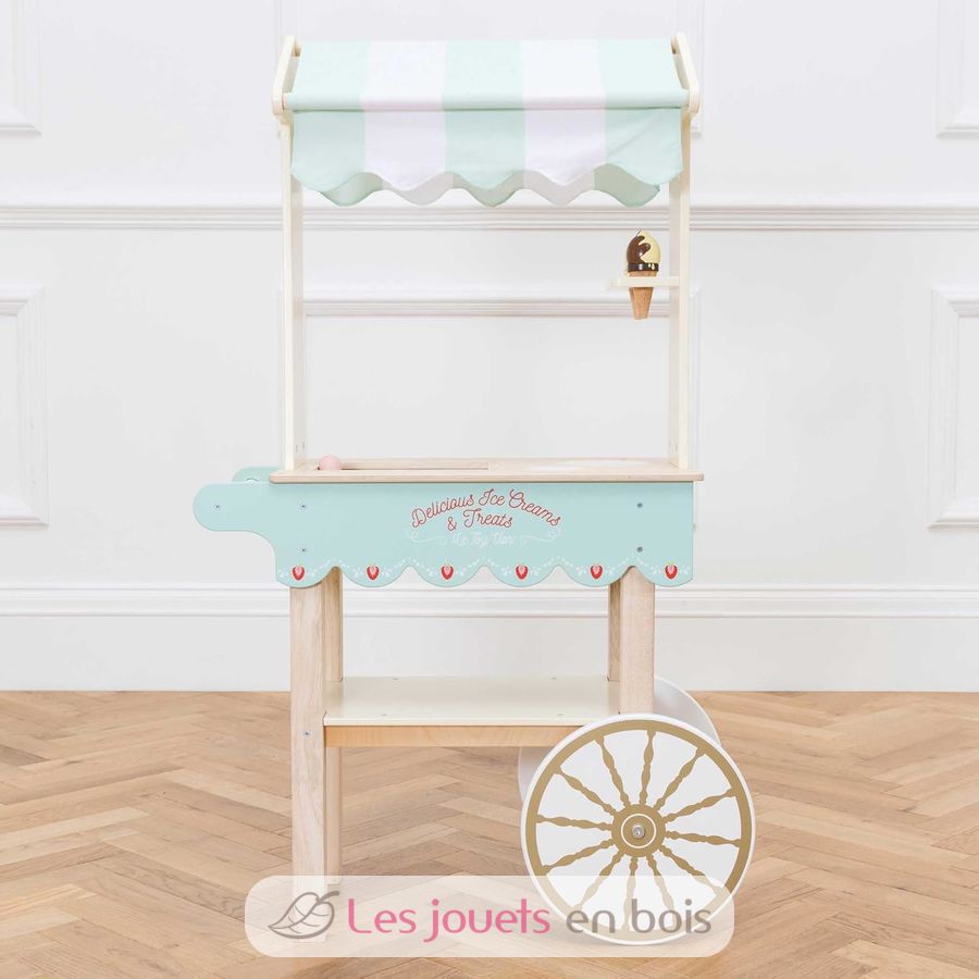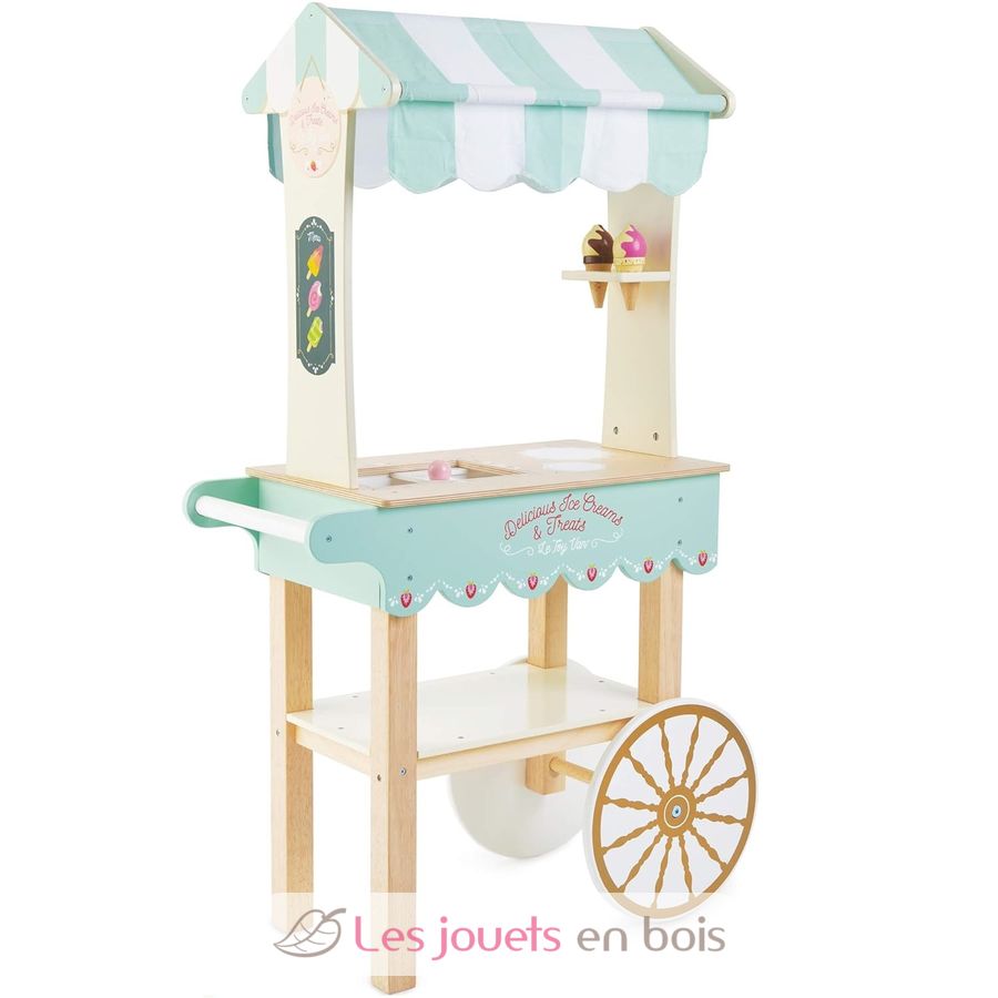 ¡A los peques de la casa les encantará jugar a ser vendedor ambulante con este simpático carrito de helados de Le Toy Van! Este bonito carrito de madera con grandes ruedas incluye un toldo de tela a rayas, una bandeja de helados, una bandeja expositora y 2 conos de helado magnéticos. El resto de accesorios se venden por separado Medidas una vez montado: Ancho 68,5 x Prof. 32,5 x Alt. 114,0 cm. Referencia TV327.