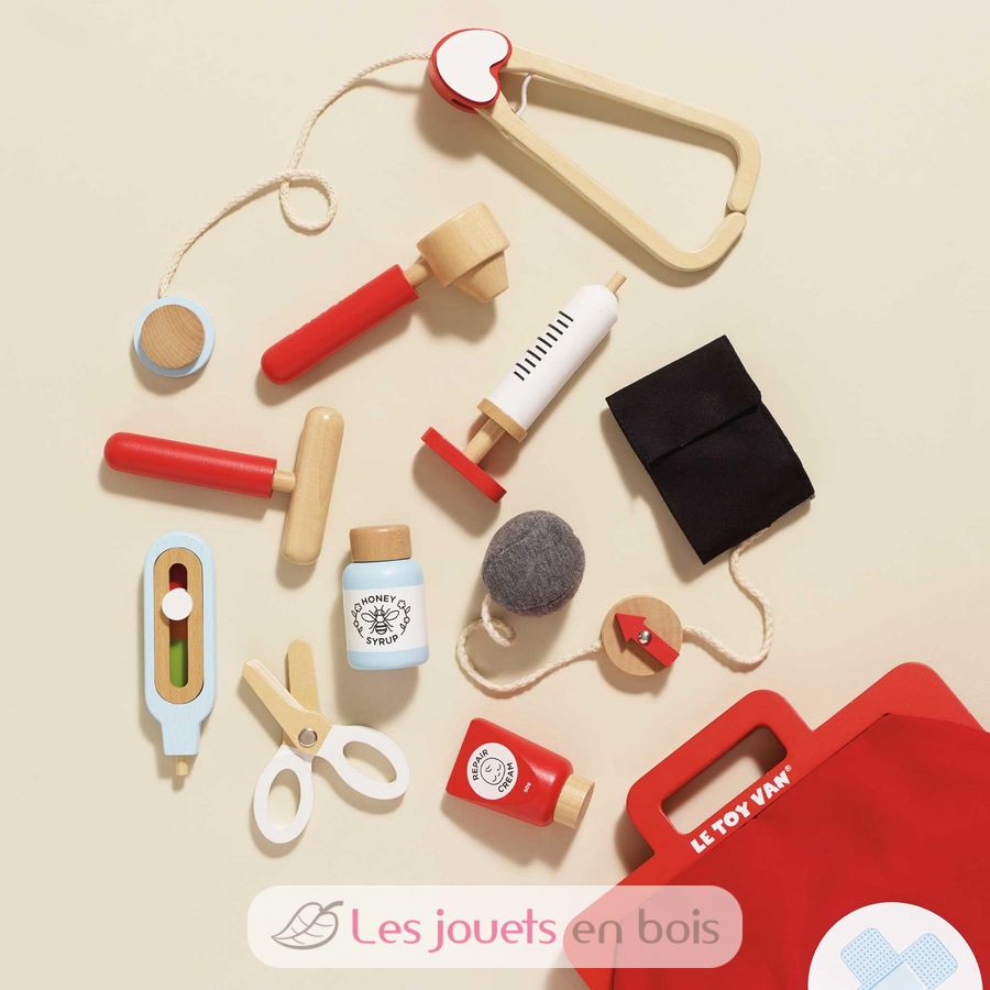 Mi maletín de doctor. Un diseño vintage, tamaño infantil, bolsa de tela con instrumentos médicos y accesorios de madera.. ¡A los pequeños médicos de la casa no les faltará de nada para tratar a sus pacientes! doctor! Este juego incluye estetoscopio, termómetro, jeringuilla, tensiómetro, otoscopio, martillo de reflejos, tijeras y dos frascos de medicamentos. A partir de 3 años. Juguete de la marca Le Toy Van. Ref.: TV292