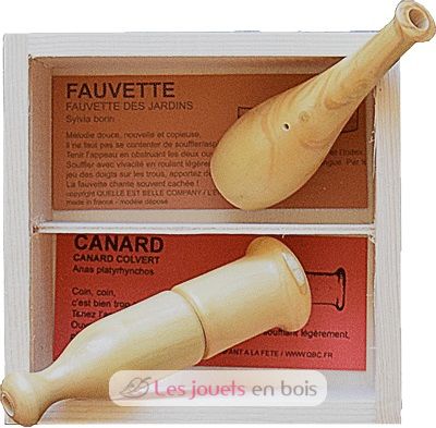 En esta caja de madera, dos reclamos de pájaros te permiten imitar el canto de la curruca mosquitera y del ánade real.