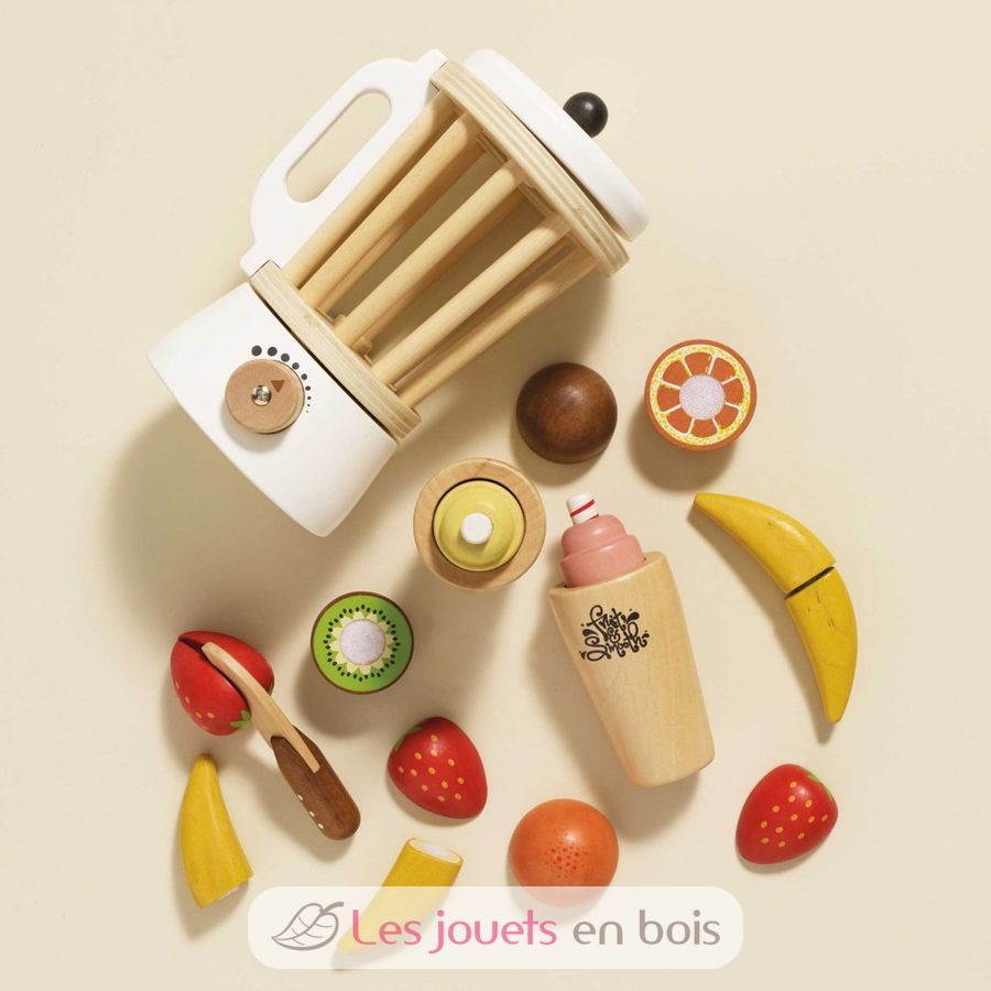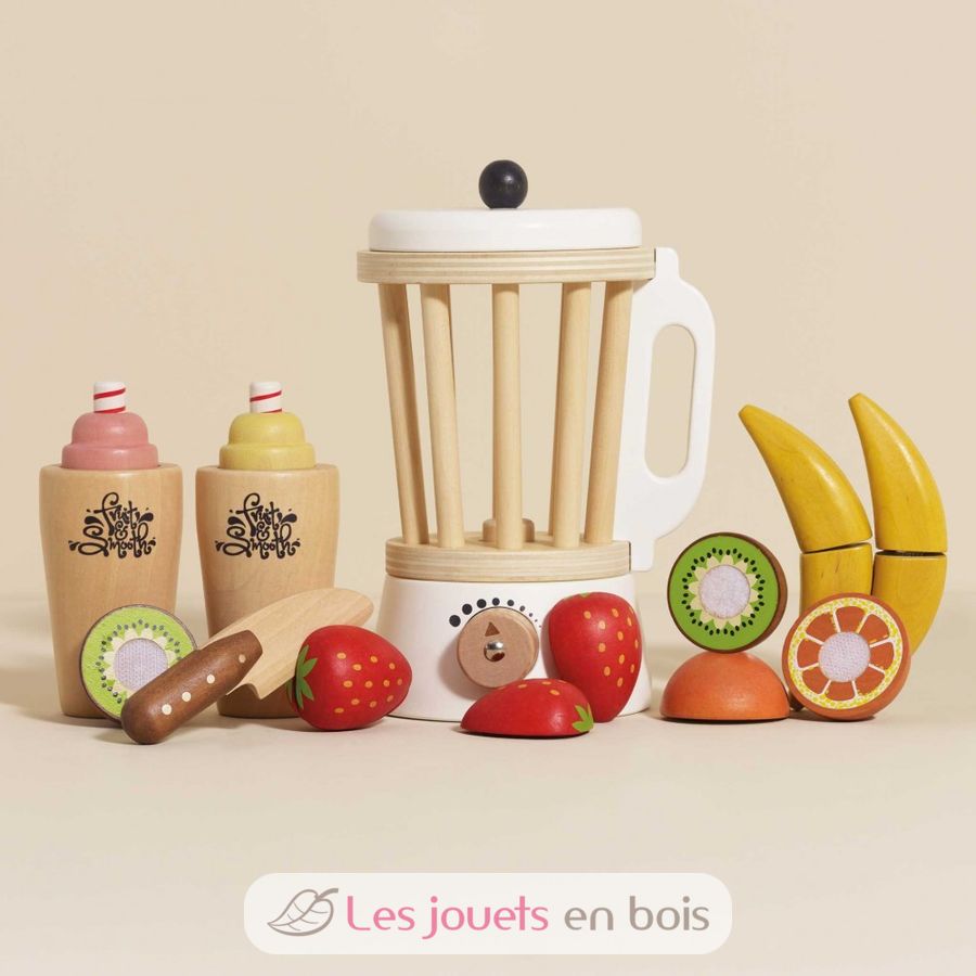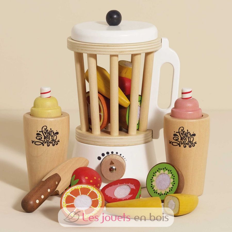 La batidora Fruits & Smooth de la colección Honeybake de Le Toy Van, permite a los niños hacer zumos, batidos y smoothies a su gusto. Un juego realista compuesto por un bol de batidora, frutas para cortar, un cuchillo de juego y 2 vasos con coberturas extraíbles. Toda la batidora Fruits & Smooth y sus accesorios son de madera.