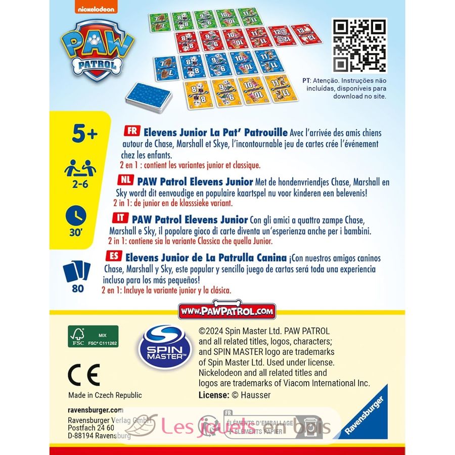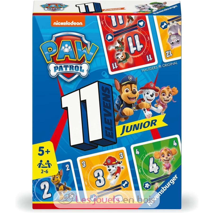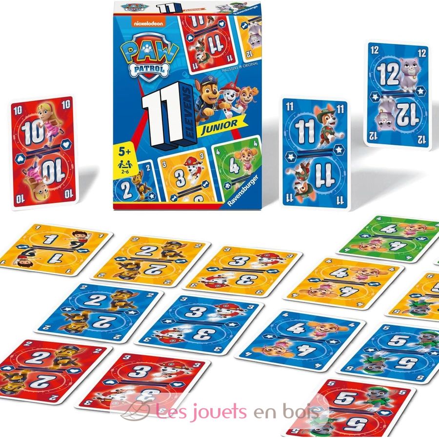 Elevens Junior La Patrulla Canina (Paw Patrol) es un juego de cartas intergeneracional muy sencillo en el que intentarás ser el primero en deshacerte de todas tus cartas. Para ello, juega tus cartas en orden ascendente o descendente en la fila de color correspondiente. Puedes jugar tantas cartas como quieras en tu turno... pero a veces es mejor no jugar demasiadas para bloquear a tus oponentes... ¡y obligarlos a robar en su turno!