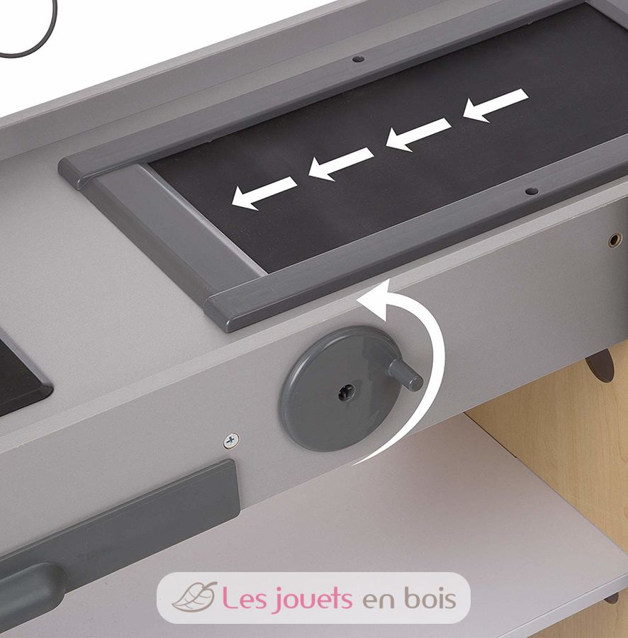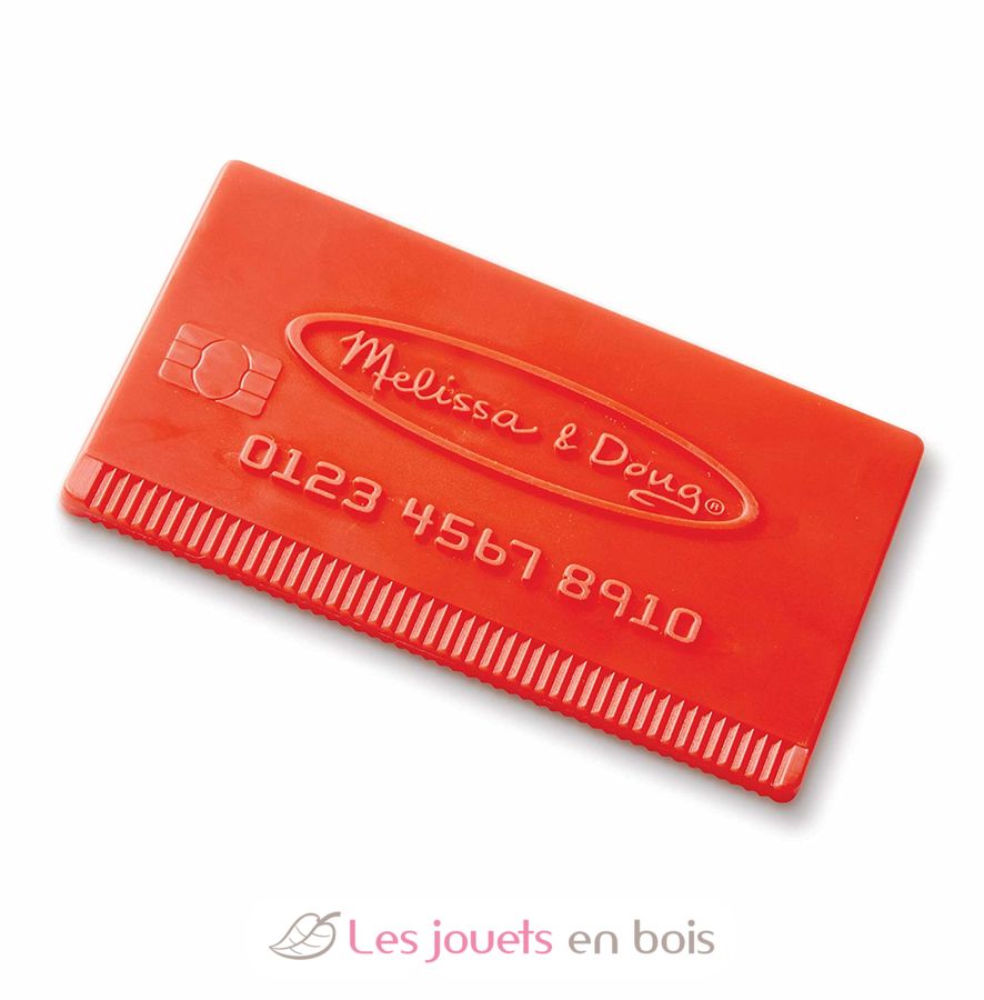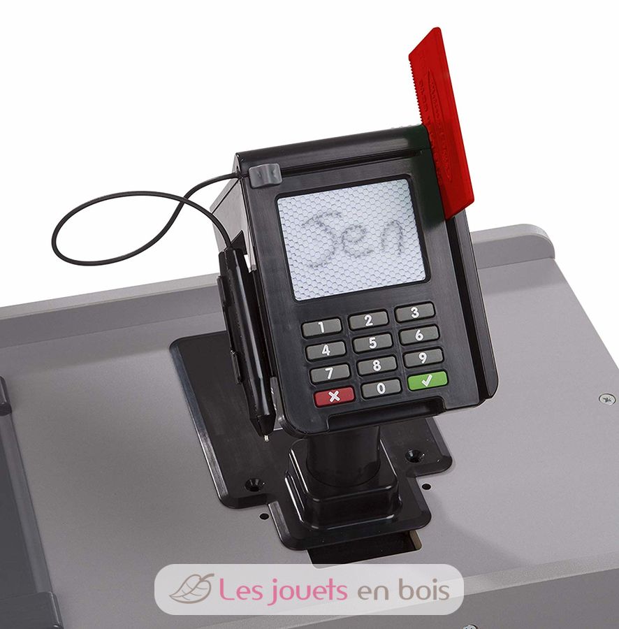 Los niños pueden hacer la compra y luego poner sus alimentos en la cinta transportadora con manivela antes de pagar sus compras en la caja. Esta caja de supermercado para niños incluye un escáner, un lector de tarjetas, una tarjeta de crédito, un teclado con calculadora y una caja registradora.