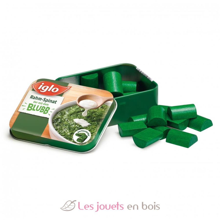 15 pequeñas porciones de espinacas de madera, entregadas en una caja metálica con la imagen de la famosa marca de congelados Iglo.