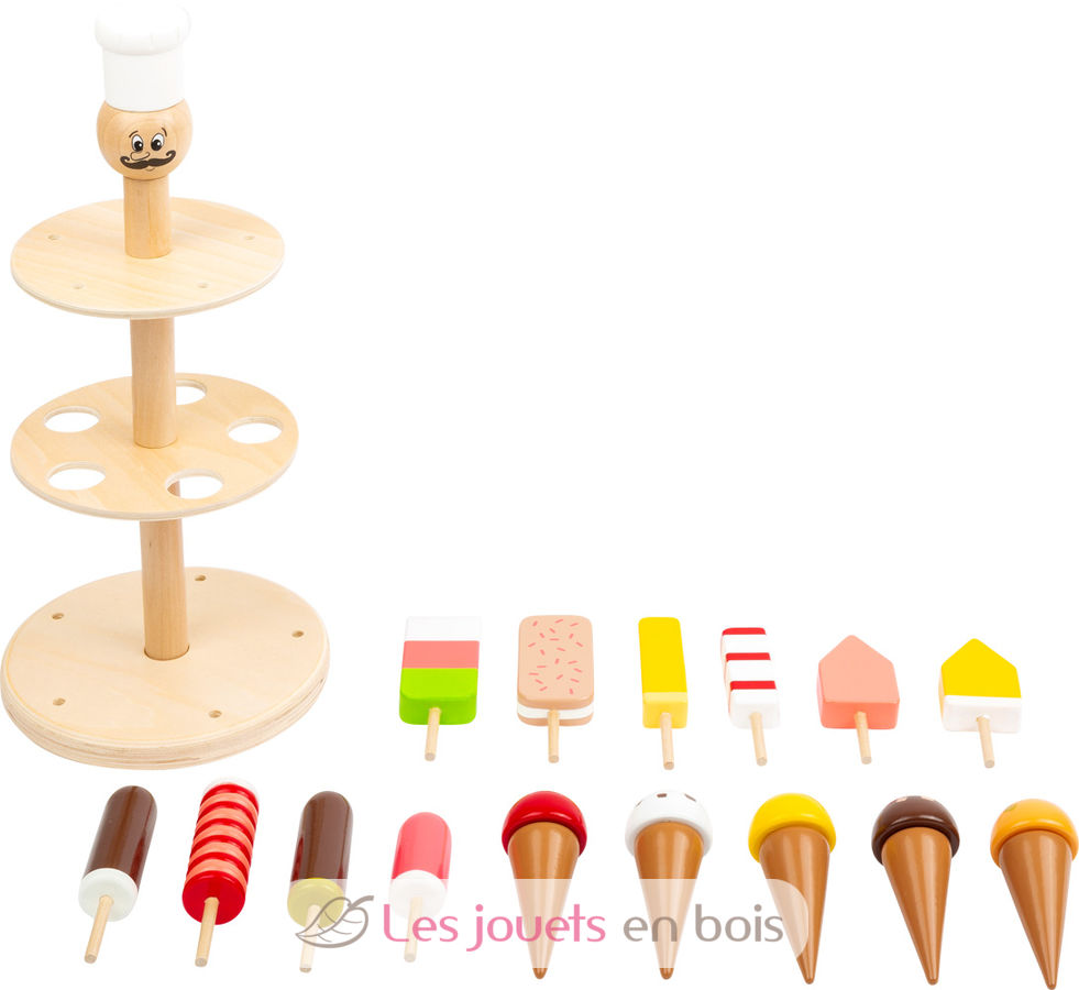Mmmhh... ¡helados! Esta estantería para helados de madera maciza, diseñada con mucho cariño, complace todos los gustos. Aquí los amantes de los helados pueden elegir su combinación favotita. Ya sea un helado en barra o en gofres, la decisión es no es fácil. Los diferentes tipos de helados se pueden colgar fácilmente en la estantería y son muy llamativos en el mostrador de la tienda de la tía Emma, que se convierte en una heladería en un abrir y cerrar de ojos.