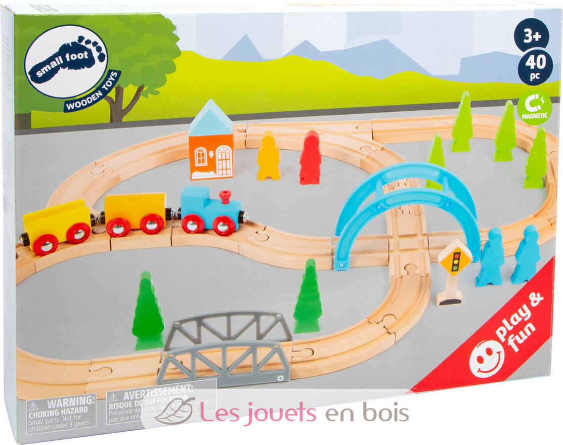 ¡Un mundo ferroviario para los pequeños exploradores! Con este set de madera, que incluye un completo juego de accesorios, los pequeños consiguen lo que desean. Aquí el ferrocarril atraviesa puentes y valles, y siempre toma una nueva ruta a través de las diferentes intersecciones de las vías. Los rieles de madera son compatibles con todos los rieles disponibles en el mercado.