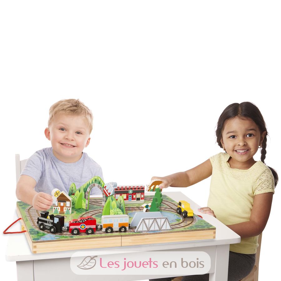 ¡Crea una zona de juegos en cualquier lugar! Este set de madera con vías incorporadas incluye 3 vagones, 1 vehículo de guardabosques, 2 árboles, 2 animales, 1 señal, 1 góndola, 1 túnel y 2 edificios. Un pequeño juego de trenes en una maleta que el niño puede llevar a cualquier parte