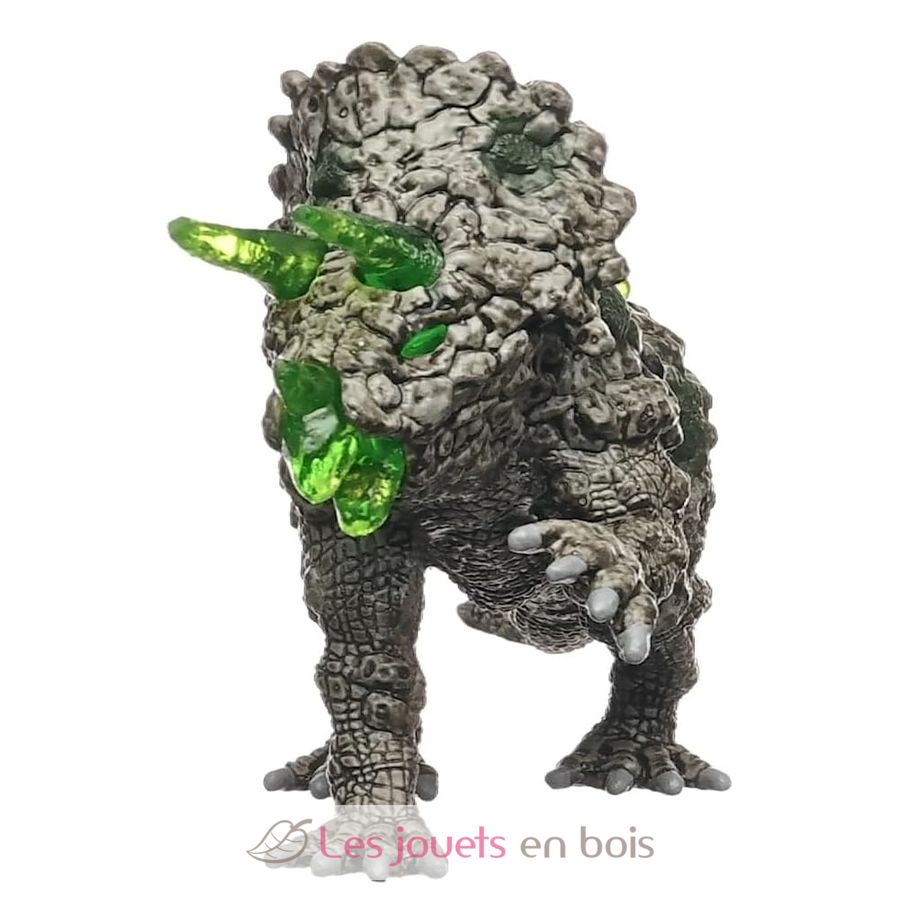Los ojos verdes del Triceratops de Stone brillan amenazantes en la oscuridad de la cueva. ¡Es un depredador escalofriante! Emite un gruñido furioso. El espacio es estrecho, y su imponente cráneo le dificulta moverse con facilidad. ¡Solo puede correr hacia adelante! Baja su gran cabeza para atacar y echa a correr. Tienes que salir de aquí rápido antes de que te ataque con los tres afilados cuernos de cristal que lleva en la cabeza. ¡Corre por tu vida!