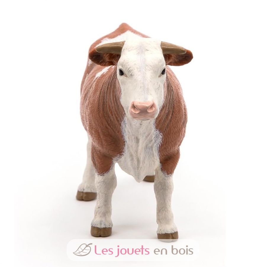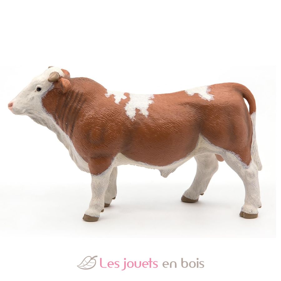 Originario de Suiza, el toro Simmental pertenece a una antigua raza de ganado apreciada por tirar cargas pesadas, por su rica leche y su tierna carne. Tiene un bonito pelaje pío y dos cuernos blancos, ligeramente más oscuros en las puntas. ¡Puede medir hasta 1,40 m a la cruz y pesar 700 kg!