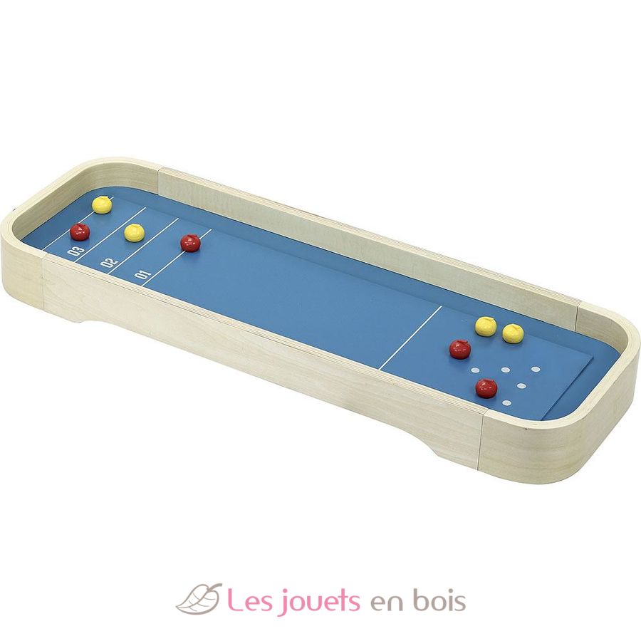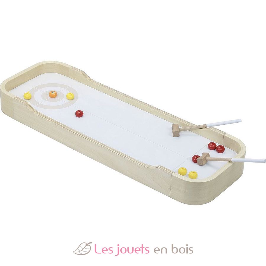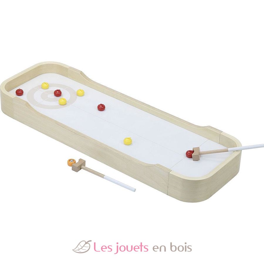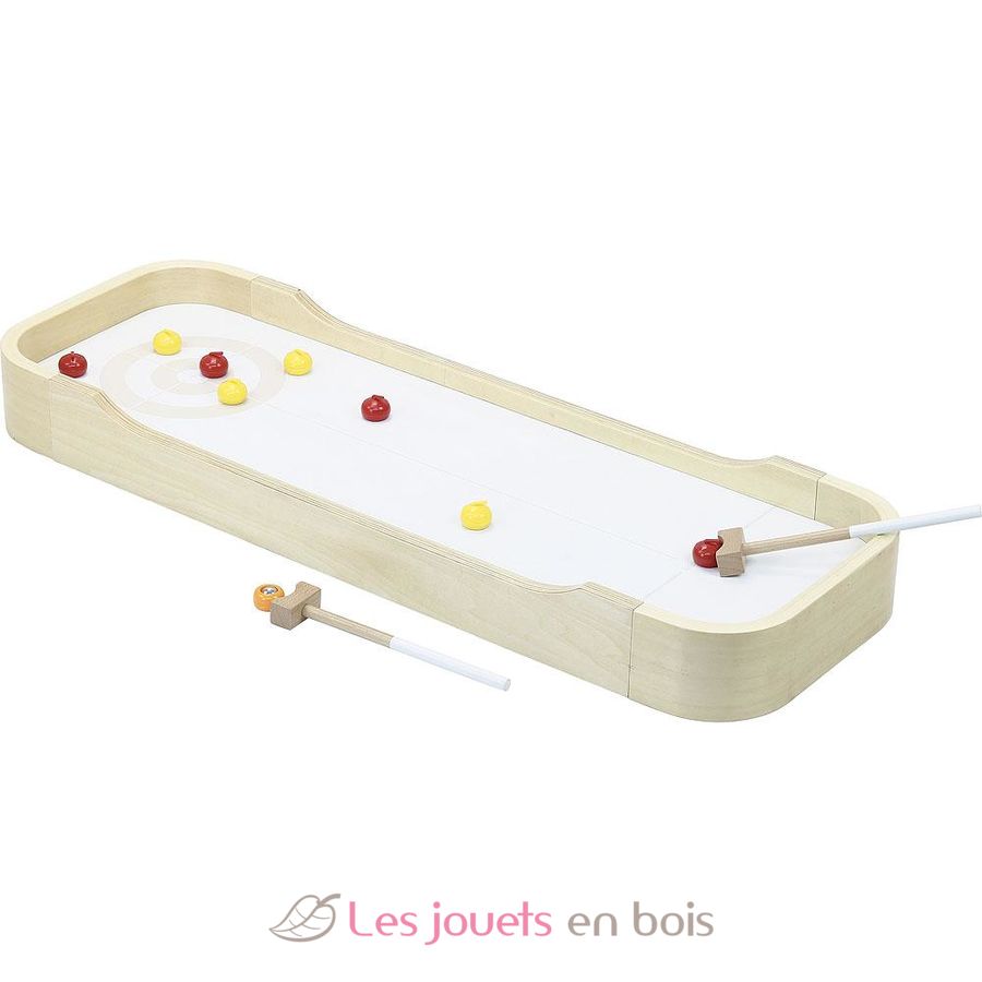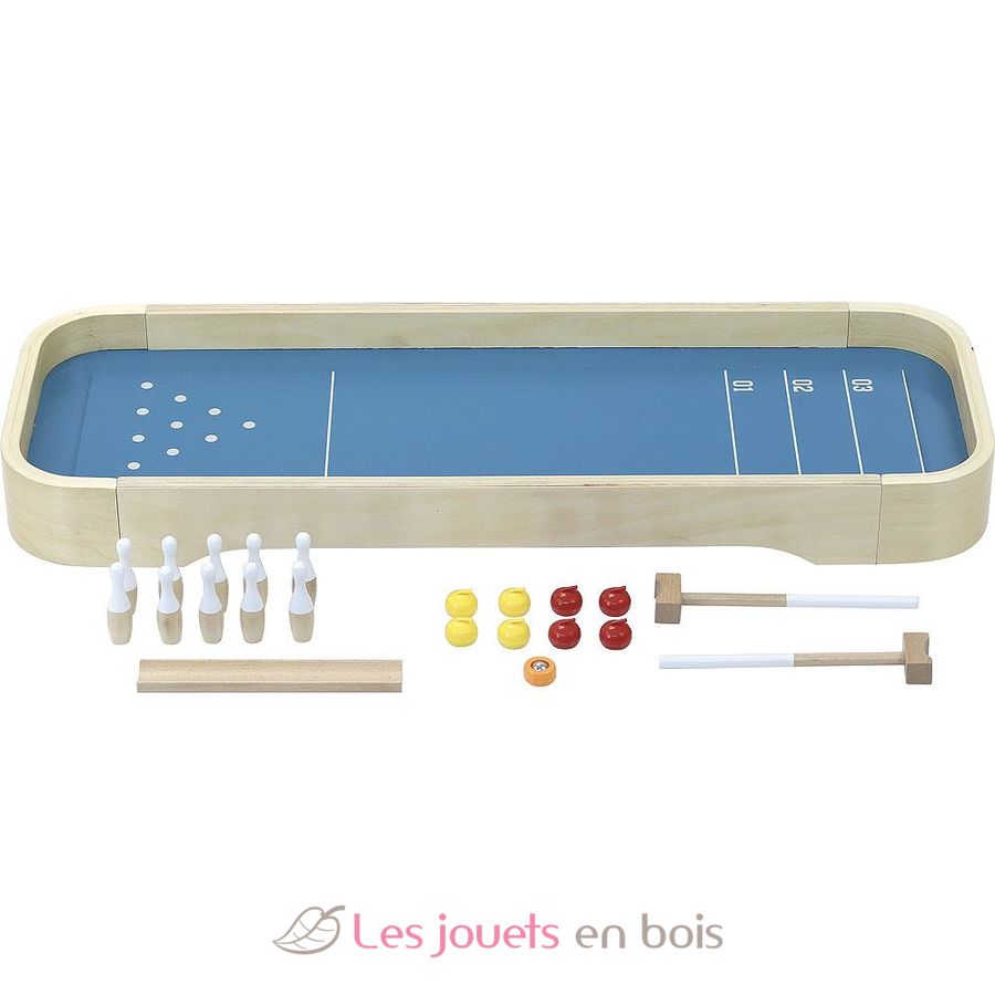 Una gran pista de minibowling en la parte delantera y de curling en la trasera. El Bowling & Curling grande viene con sus accesorios de madera y plástico: 10 bolos, 2 bolas y un lanzador, 8 bolos de curling, 1 portería y 2 palos de juego.