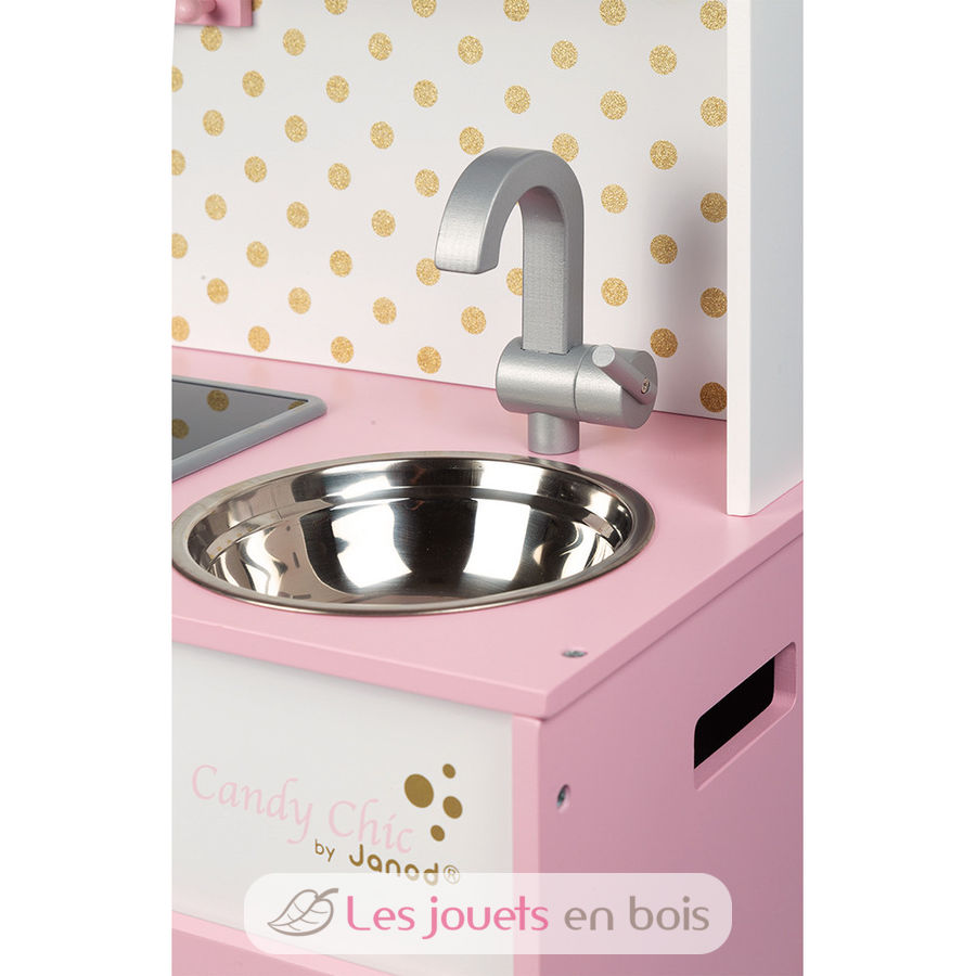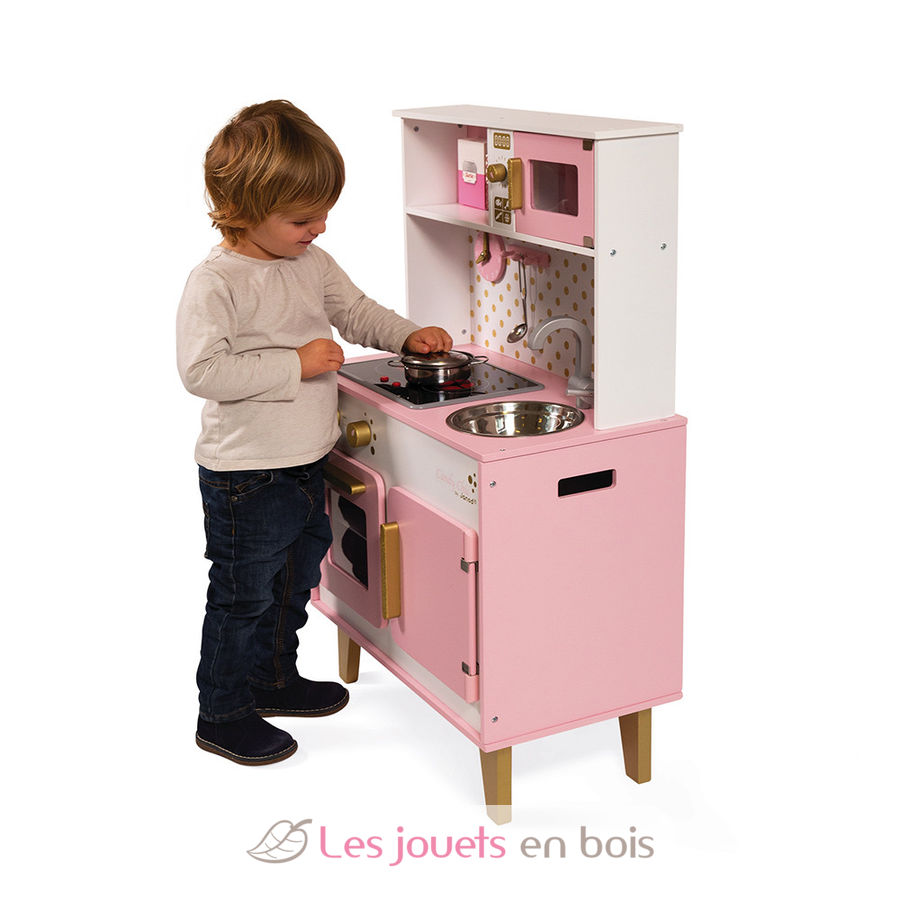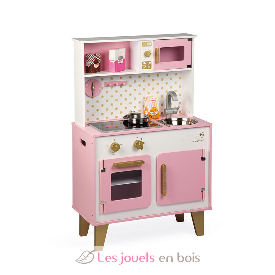 Gran Cocina Candy Chic en colores caramelo y algodón de azúcar de Janod. ¡Los niños (a partir de 3 años) se lo pasarán bomba imitando a sus padres y convirtiéndose en grandes chefs. Está perfectamente equipada con numerosos accesorios: un gancho para colgar el cucharón de metal, una sartén y una tapa de metal y tres cajas de cartón para alimentos (zumo de naranja, cacao, azúcar). Esta cocina infantil también dispone de una placa de inducción con sonido y LED: basta con pulsar una vez los botones rojos para que las placas se enciendan, y una segunda vez para oír el sonido del agua hirviendo. El sonido y las placas de inducción se apagan automáticamente al cabo de 30 segundos o pulsando los botones rojos por tercera vez. Esta bonita cocina infantil de madera totalmente equipada también incluye un horno con 3 mandos giratorios y sonido, un microondas, un armario para guardar accesorios, un fregadero de acero inoxidable y un reloj. Altura de la encimera: 50 cm. Gran cocina Candy, una cocina de madera de la marca Janod. Referencia J06554. Funciona con 2 pilas LR6 de 1,5 V no incluidas.