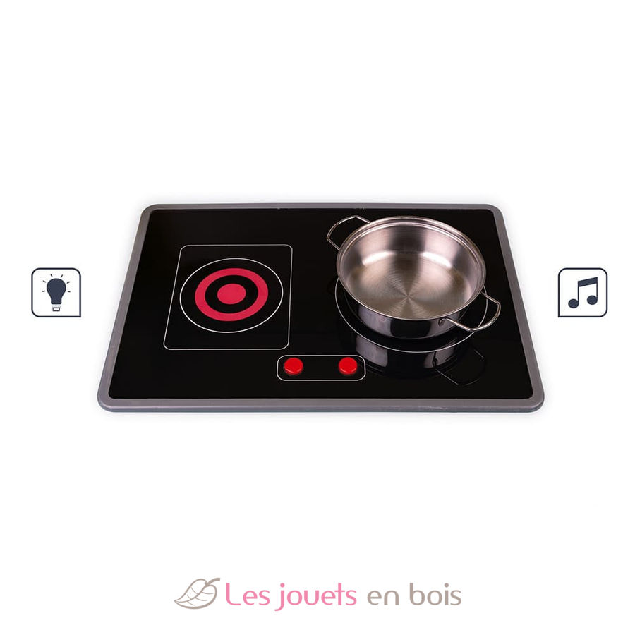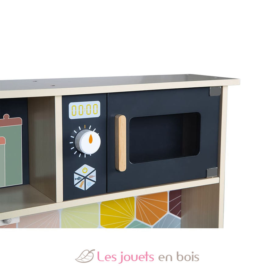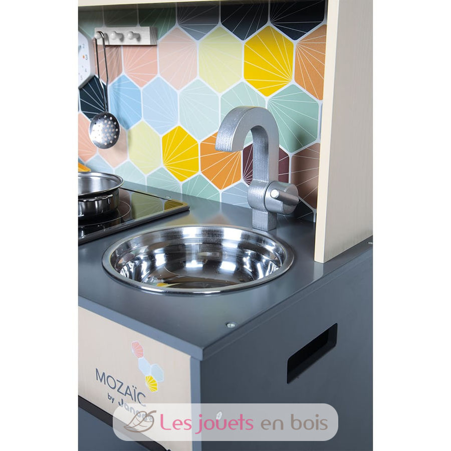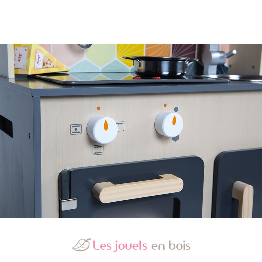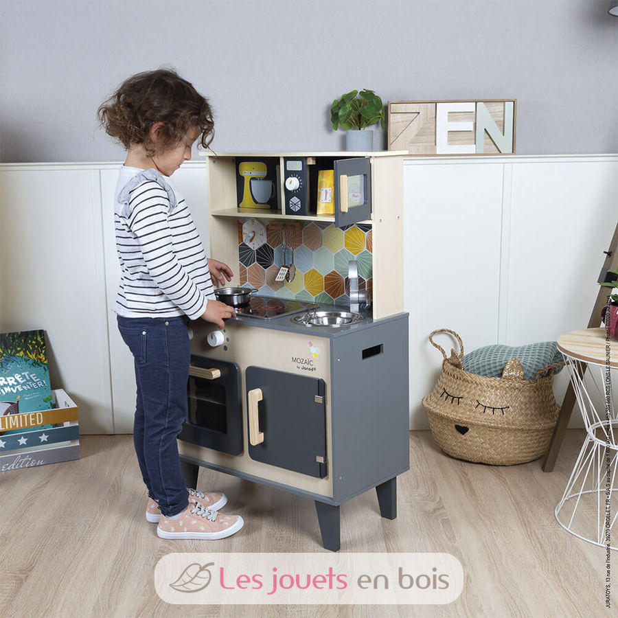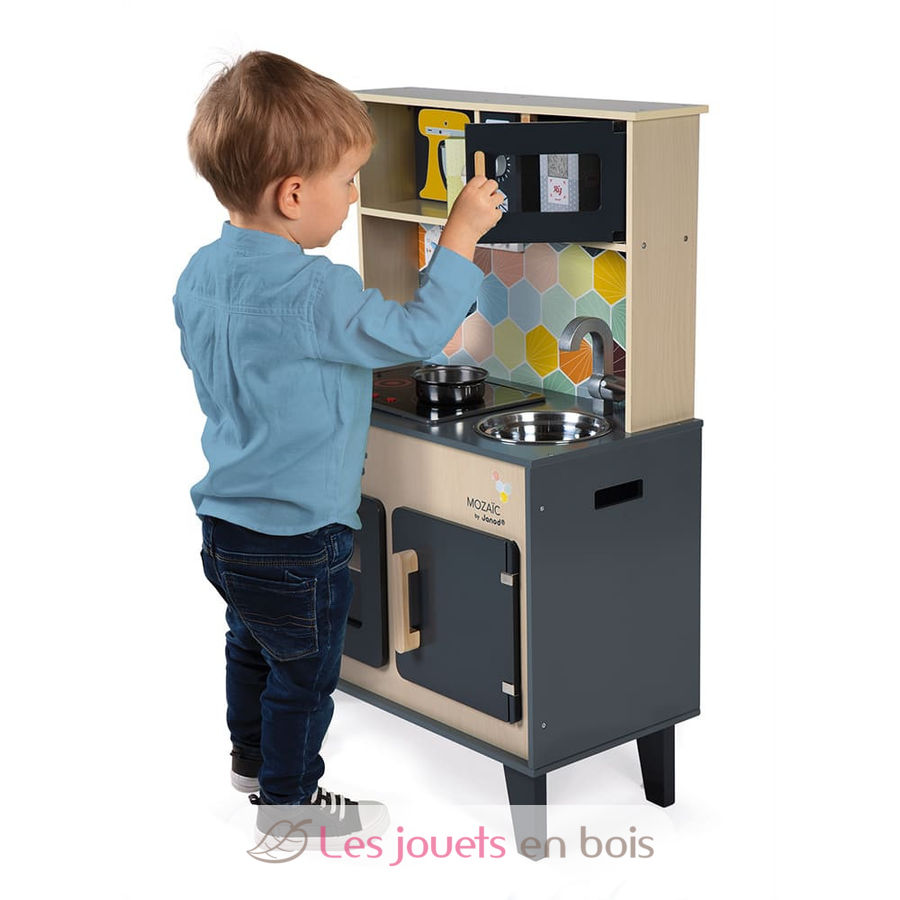Cocina de madera entregada con 6 accesorios. Madera natura, pintura negra, mosaicos de colores ¡Esta es una cocina infantil tiene un carácter y personalidad indiscutibles! Este cocina de juguete es ideal para los peques de la casa den rienda suelta a su imaginación creando platos dignos de un chef ¡Aunque seguro que su inspiración viene de papá y mamá! Esta gran cocina de madera Mozaïc está equipada con un gancho para colgar 1 espumadera, 1 cacerola y 1 escurridor de metal y3 cajas de cartón para alimentos (queso, harina, arroz). Para hacer la experiencia aún más realista, también cuenta con una placa de inducción con sonidos y LEDs: basta con pulsar una vez los botones rojos para que las placas se enciendan y una segunda vez para oír el sonido del agua hirviendo. El sonido y las placas de inducción se apagan automáticamente al cabo de 30 segundos o si pulsa los botones rojos por tercera vez. Esta bonita cocina de diseño totalmente equipada también incluye horno, microondas, armario, 3 mandos giratorios con sonido, fregadero de acero inoxidable y reloj. Se necesitan 2 pilas alcalinas LR6 - 1,5 V (no incluidas). Medidas: 55 x 30 x 87 cm. Altura de la encimera: 50 cm. Gran cocina Mozaic, una cocina de madera de la marca Janod. Referencia J06609.