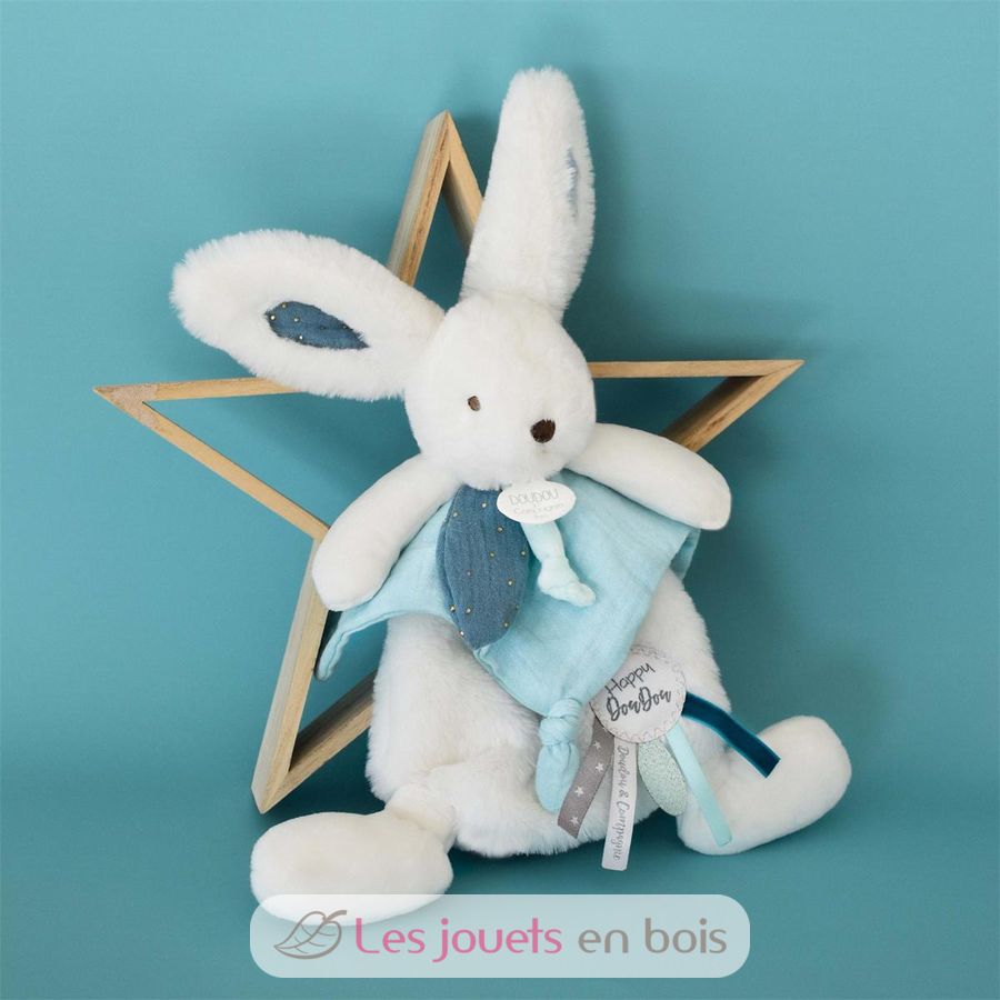 Peacock Doudou Rabbit de la gama Happy Pop, un peluche de la marca Doudou et Compagnie que acompañará al bebé a todas partes