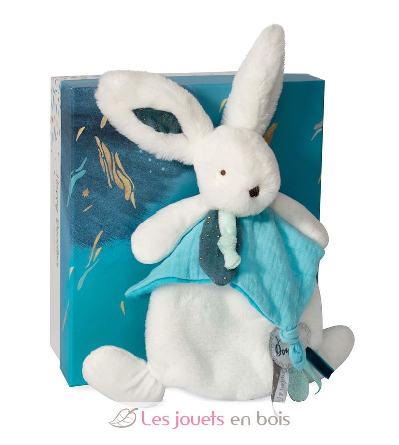 Los peluches de la colección Happy Doudou To You son conejos blancos, extremadamente suaves y tiernos, trabajados de forma de alta costura. Elegante, Mix and Match, con su pompón azul pavo real, adornado con toques de pañuelos de color aguamarina y pavo real, así como adornos de fantasía y cintas tejidas inteligentemente coordinadas, este alegre conejito brilla con audacia. Enclavado en una magnífica caja de regalo con gráficos que evocan a la vez la modernidad y el lujo, como en un estuche mágico, este peluche sorpresa se desvela con delicadeza... los primeros momentos se saborean descubriendo su pompón que sobresale de la caja. Un regalo ideal desde el nacimiento.