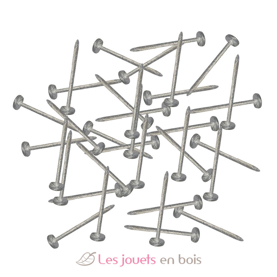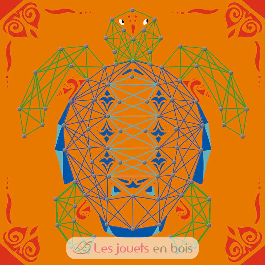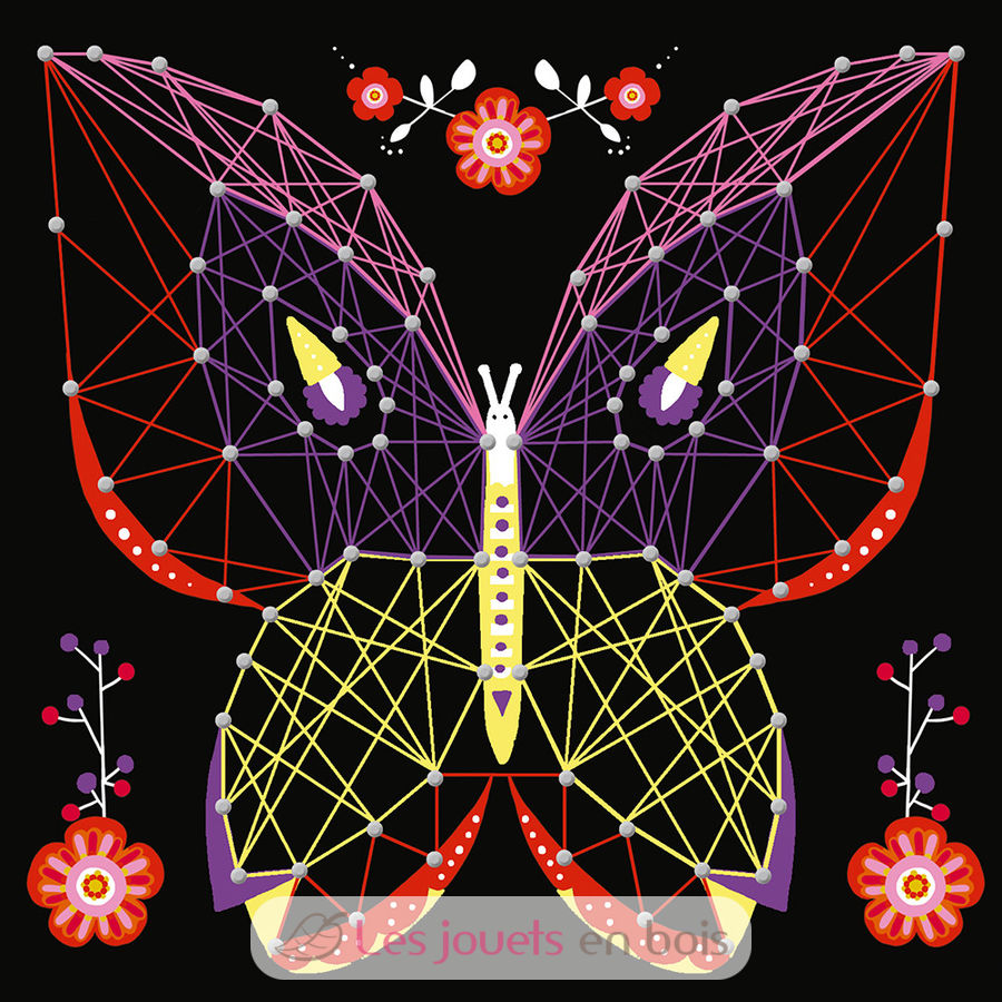 5 cuadros de hilos tensados para llevar a cabo con la ayuda de 10 madejas de hilo de algodón de 7 metros, 800 clavos y una herramienta para clavar los clavos. Incluye un librito de instrucciones con ejemplos.
