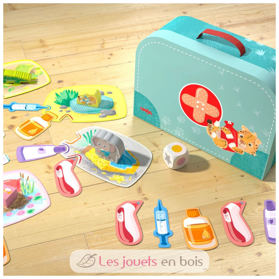 Vaya… los animales están enfermos y necesitan atención urgente. Al cocodrilo le duelen los dientes, el elefante está resfriado, al guepardo le duele el estómago y el fl amenco se ha roto una pata. Traed el maletín y ocupaos de lo que puedan necesitar. ¿Quién les aplicará el tratamiento adecuado y colocará primero las piezas correctas en su tablero?