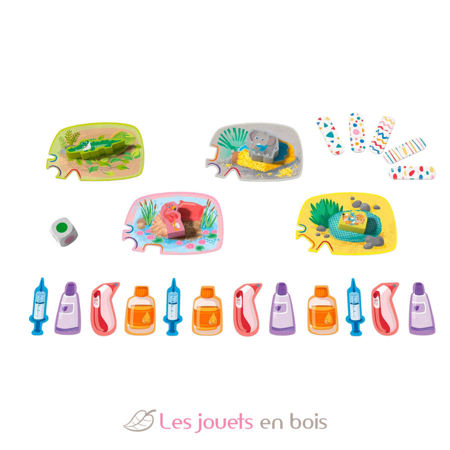 4 animales (un guepardo, un cocodrilo, un elefante y un flamenco), 1 dado, 4 camitas (los tableros), 12 medicinas (el jarabe, la jeringuilla, la bolsa de agua caliente y el termómetro), 5 tiritas, 1 instrucciones del juego.