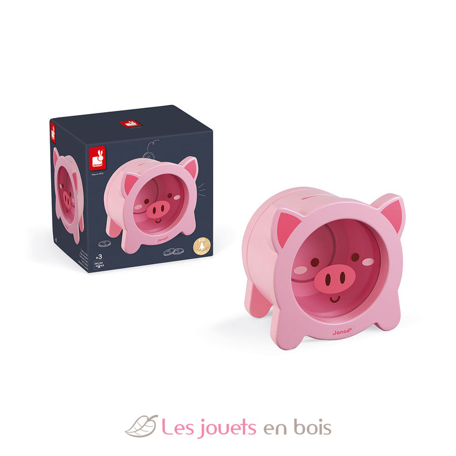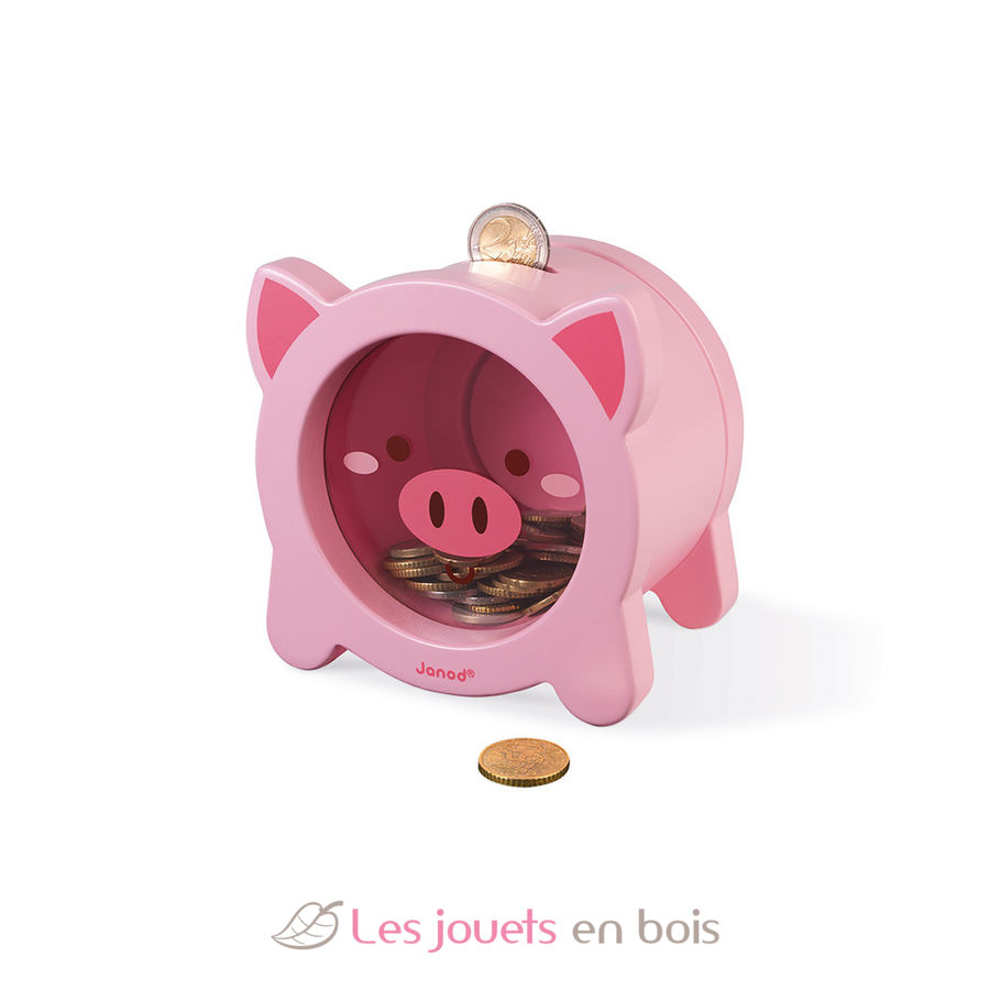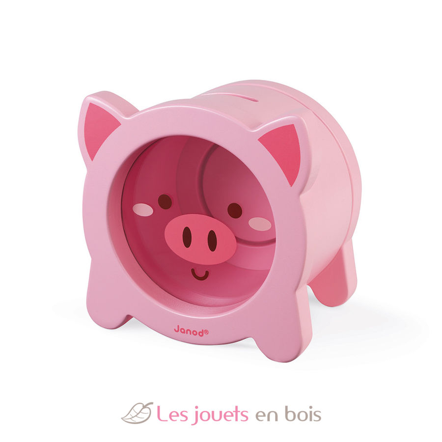 Una hucha con forma cerdo rosa de madera lacada para que tus hijos aprendan a ahorrar. Hucha decorativa de la marca Janod.