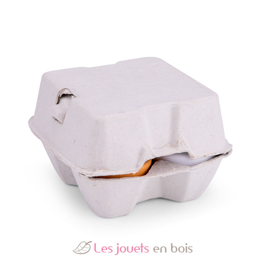 Una caja de huevos que contiene 4 huevos de madera, ideal para jugar al comedor. Estos huevos de madera tienen velcro para que los niños puedan divertirse cortándolos para cocinar, antes de volver a unirlos.