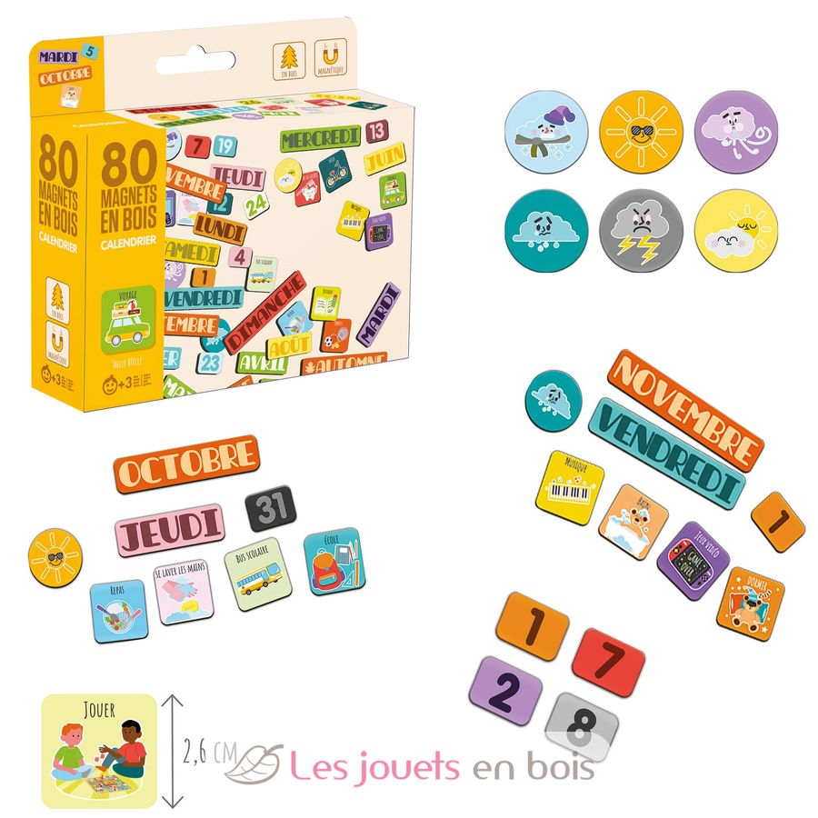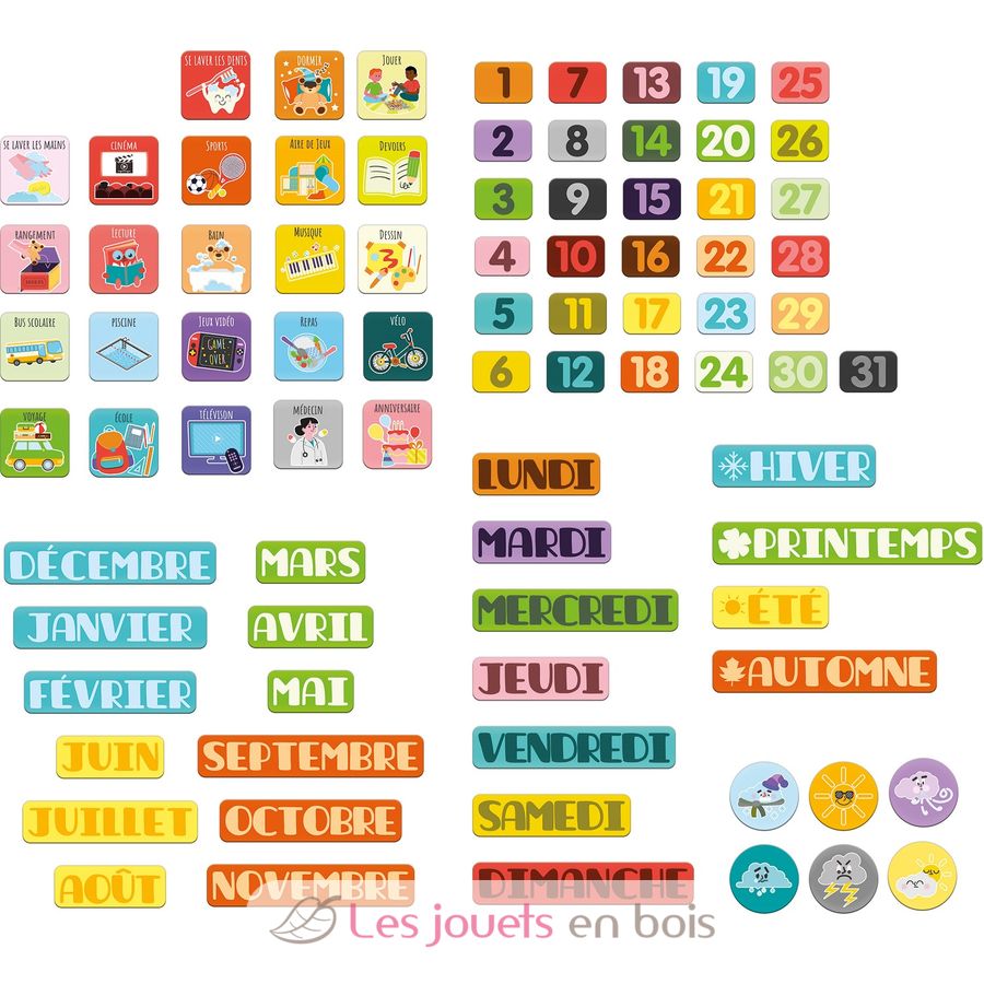 Contenido: 23 imanes de actividades, 31 imanes con la fecha actual, 12 imanes con los meses, 7 imanes con los días, 4 imanes con las estaciones y 6 imanes con el clima.