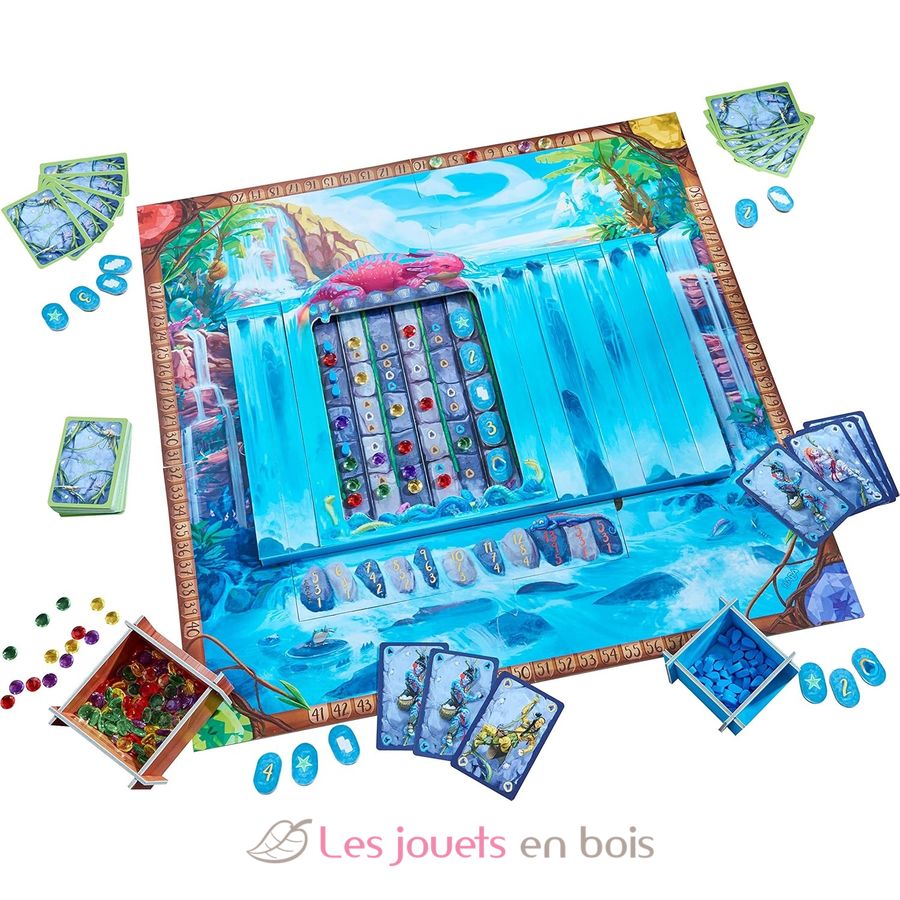 Contiene: 1 tablero de juego de 4 partes con 5 tiras de roca intercambiables, 2 tableros de puntuación, 2 raíles de plástico, 45 fichas de bonificación (35 de reverso claro, 10 de reverso oscuro), 1 marco de agua, 8 tiras de agua, 60 cartas, 140 gemas (35 de cada uno de los cuatro colores), 1 caja de gemas, 50 gotas de agua, 1 caja de gotas de agua, 1 regla de juego.