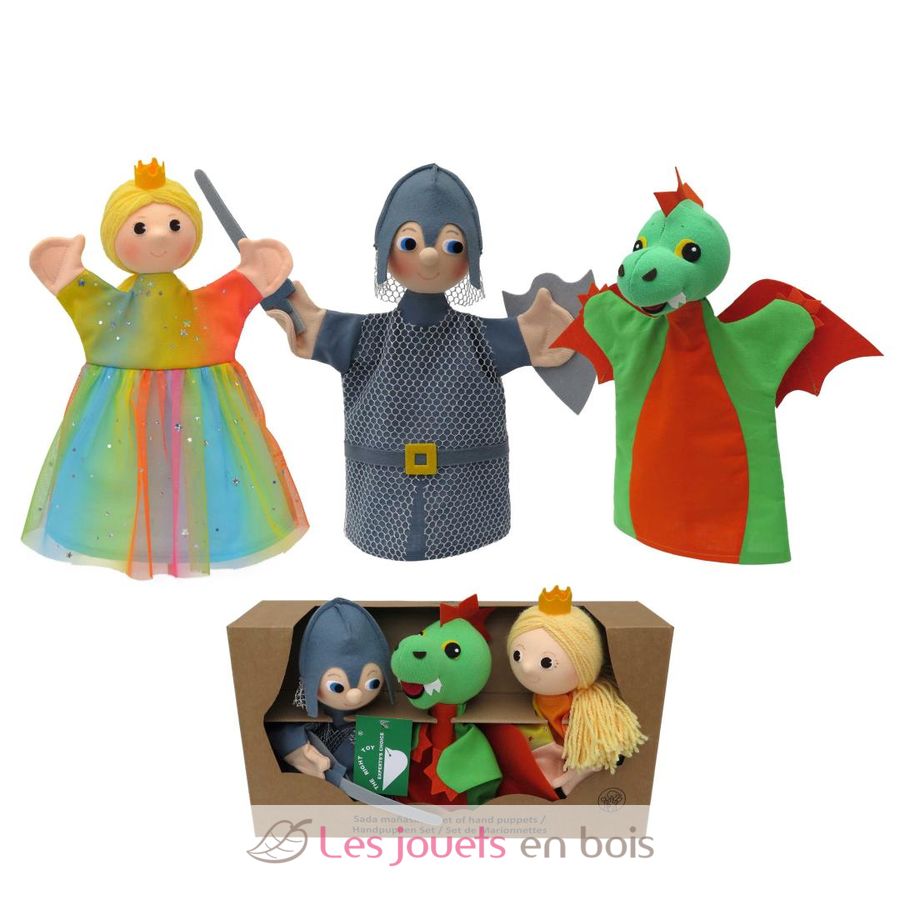 Set de 3 marionetas de mano con temática de dragón: un dragón, un caballero y una princesa.