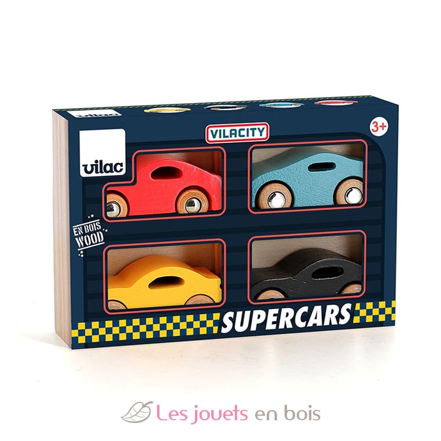 Juego de 4 coches de madera Supercars, vehículos de madera de Vilac. Referencia 2369.