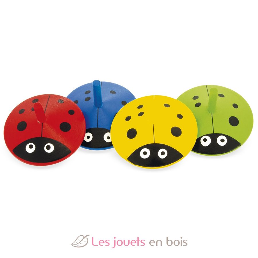 Este juego incluye peonzas de mariquita en 4 colores diferentes: rojo, azul, verde y amarillo.