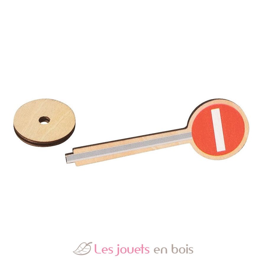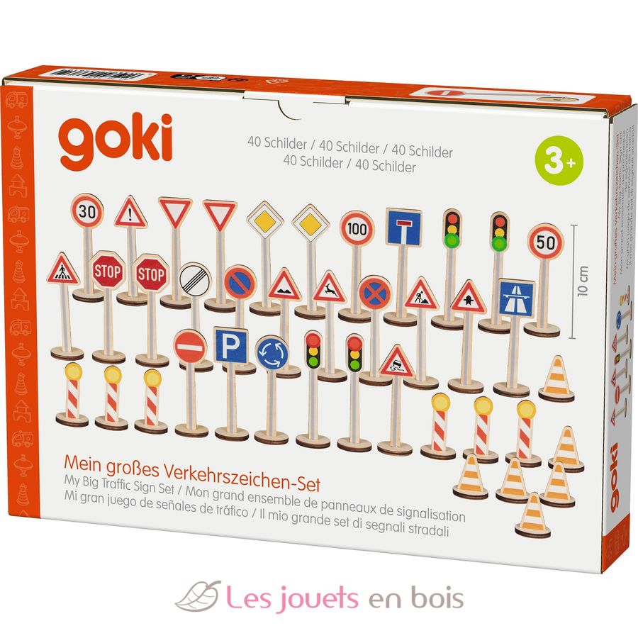 El juego de señales de tráfico goki consta de 40 señales de tráfico diferentes, perfectas para dar vida a toda una red vial en miniatura. Tanto los carteles como los soportes son de madera contrachapada.